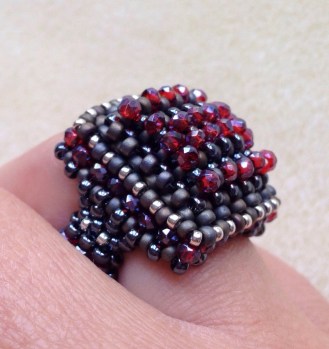 Previous Image Next Image Quetzal Ring – Steel and ruby Quetzal ring – Marcia DeCoster (beaded by Sarah Cryer) Designed by Marcia DeCoster, from Beaded Opulence (Lark Books), beaded by me. http://www.marciadecoster.com/