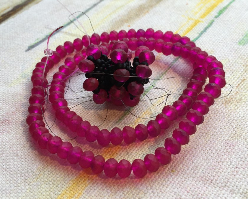 This is a barely started Jean Power Affinity Bangle – using very cool rubber coated rondelles from my now defunct local bead shop. I think I have enough to get me through it (I kept buying more in their drawn out closing sale), and I’ve made one before which was a joy, so I want to get going on this soon as the colours are more winter than summer and I think it will be lush!
