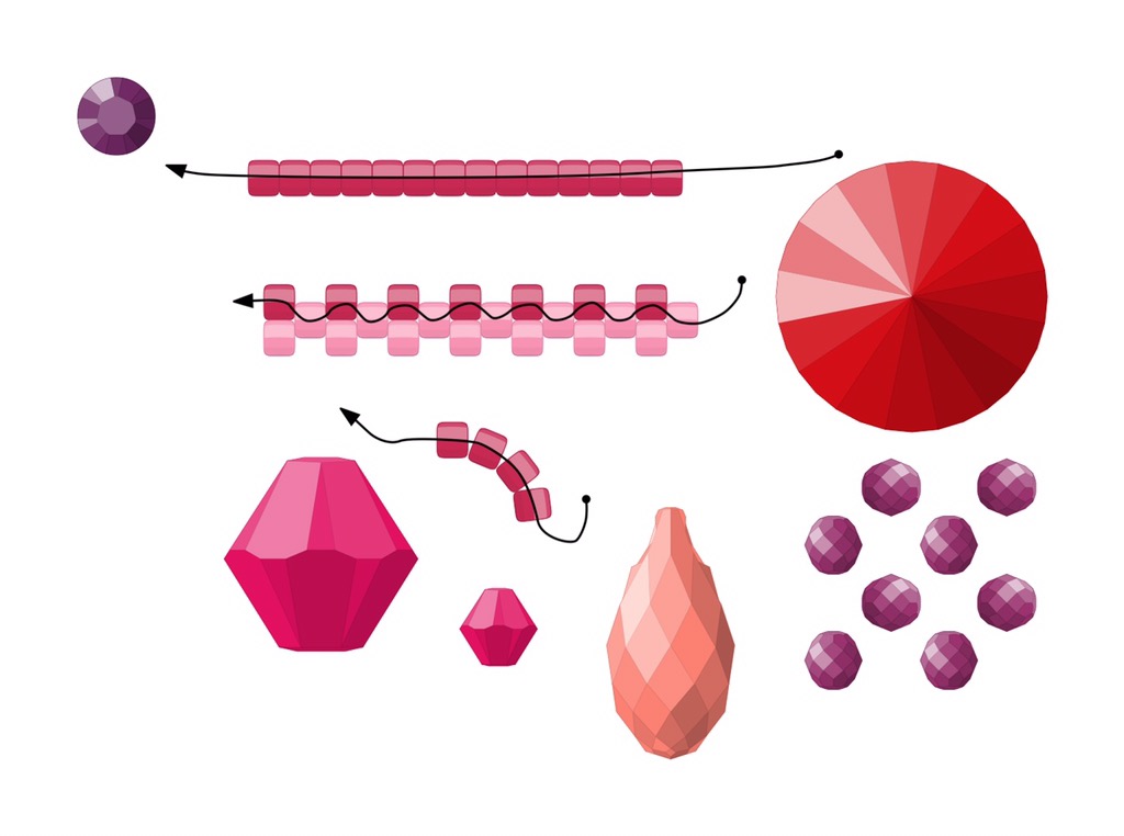 • Key bead types available ready rendered, accurately sized/shaped.  I have to build each bead myself in Inkscape, guessing at the rough size in comparison to other beads, select a rough colour and then add a custom colour gradation to make them look 3D.  This takes a while, and there is no way my Inkscape rivolis, bicones and fire polished beads look like these Perl Art ones: