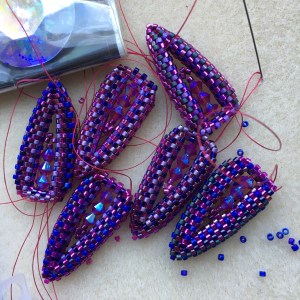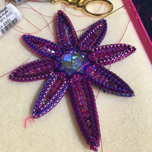 But the pattern is lovely – very Jean, annoyingly clever, and the finished result is splendid. I went for a ‘change colour every row’ approach as that seems to be becoming my thing for peyote with delicas, and I love the finished effect, which used purples and fuchsias. It’s used up a few more beads from my stash, and meant I didn’t have to buy more to have enough of a single colour. The central crystal AB Swarovski crystal was also from my stash, as were the lovely fuchsia 2xAB bicones. It’s now hanging from our desk light – it was far too lovely to send up into the loft when we took the tree down!