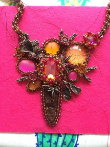 So, the finished piece was ready, and I posted it off to the lovely Denise at the Guild, who runs the challenges. And this was my description ‘Inspired by the work of the late Christopher Lloyd I planted a ‘hot’ bed. Filled with dahlias, cannas, bananas and tropical beauties in hot and rich shades, and with bronzed foliage and interesting seed heads, it would look its very best in the balmy ‘Indian Summer’ of early autumn. Unfortunately the English weather combined with an appalling number of snails means the crucial dahlias keep drying out or getting eaten, so this piece represents how it looks in my imagination rather than in reality. It includes my own hand painted cabochons, wonderful Anna Bronze findings, Swarovski crystals and much more.’