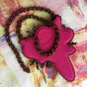 By the time I’d done all that the main piece was getting a little floppy – both from the weight of the pieces, and from the amount of stitching (as this will inevitably make the backing less rigid), so I added another slightly smaller layer of Nicole’s Bead backing before adding a fuchsia Ultrasuede backing fabric and beading round a simple ‘sunshine’ edge. I had planned to do a fancier edging but at this point I realised that I needed to stop and not overdo things!