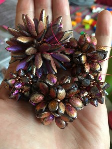 And boy do I have a lot of beads in that set – it felt like I’d been collecting treasures for years with this challenge in mind. I then started to bead, beginning with my favourite etched sliperit Czech beads, working through an idea for beading concentric circles to form a dahlia, working towards a huge set of flowers, and also working on some large beaded beads.
