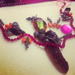 On the huge tray of pulled beads I had some amazing ‘Crystal Astral Pink’ Swarovski stones which I’ve been hoarding forever, and looked amazing against the bronze. They also looked great with some lunasoft fuchsia cabochons, but that gave me a little too much pink, so I knocked up some cabochons of my own using orange Pebeo Prisme to balance them out. With the largest Astral Pink stone in the centre I was starting to get a bunch of stones that worked, but for a necklace I like to reflect the shape of the ‘decolletage’, so I needed something to basically point downwards into the chest! After a couple of failed attempts to make a marquise shaped cab myself I turned to Designer Cabochons and found a lovely dark marmalade agate drusy cab, and I had my set.