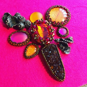 Once I’d finished all the bezelling and finalised the layout I glued the flat backed bezels onto another piece of bead backing, and where needed, added more rows of bead embroidery. I added the bronze pieces, and then before adding the final bezelled rivolis and crystals, filled in all of the visible backing with seed beads, crystals and groups of fuchsia agate berries.