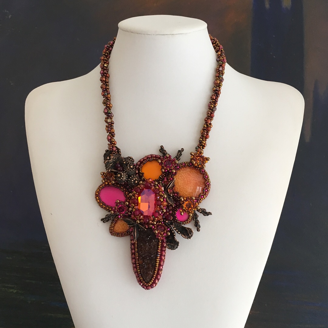 But then I discovered the wonderful work of Anna Bronze, a Russian artist working with lost wax castings to form beautiful natural forms. She had a beautiful range of seed pods and spices which played perfectly to the late summer theme, so I took a deep breath and ordered some (hand made work of this quality understandably does not come cheap). And when they arrived that of course threw the whole plan up in the air. The dark bronze was very striking, but didn’t work at all with the etched beads. It needed something deeper and richer, and I needed to get some crystals into play. And then I thought of the ‘Diva’ necklace I’d loved making earlier in the year, and started playing with putting together a collection of bezelled cabochons with the castings in a similar way.