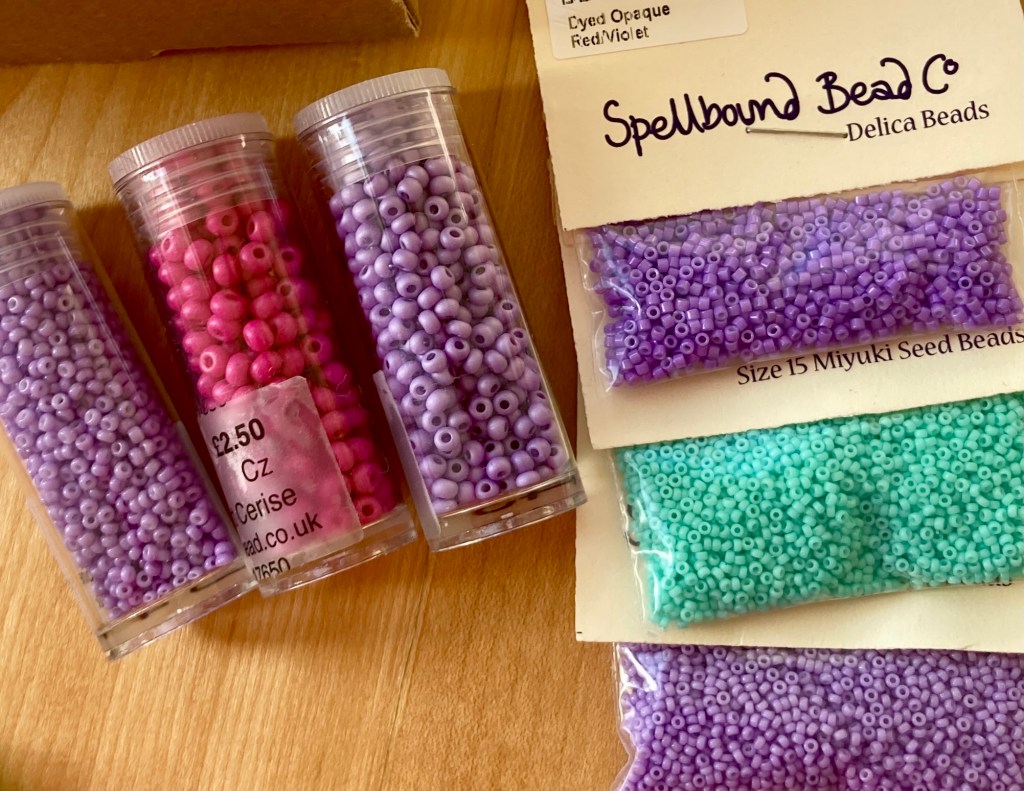 So, a tiny bead haul from Spellbound Beads (let’s be honest, I already have enough beads). I seem to be obsessed with using lilac and lavender as highlight colours at the moment and as I’ve never really used them before I need to build up a bit of a stash there. And obviously I like to support bead shops. Those are my excuses.