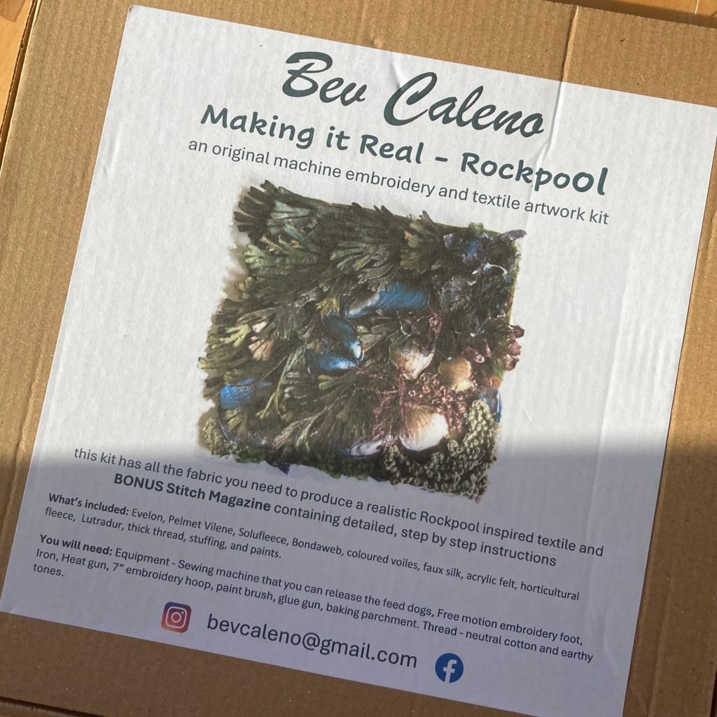I also went back to see Bev Caleno’s work about half a dozen times – just incredible artistry and using common themes to much of my work so it really spoke to me. Bev works with machine embroidery and mixed media, with a lot of hand painting, texture, heat manipulation and other fascinating techniques, and the results are gorgeous. Her mushroom pieces are incredible but I finally chose one of her new rock pool kits – this is going to keep me busy for a while and teach me lots of new techniques, plus new takes on techniques and materials I’ve used before, so will be very inspiring. It was lovely to have a chat with Bev and I’ll be following her work for sure.