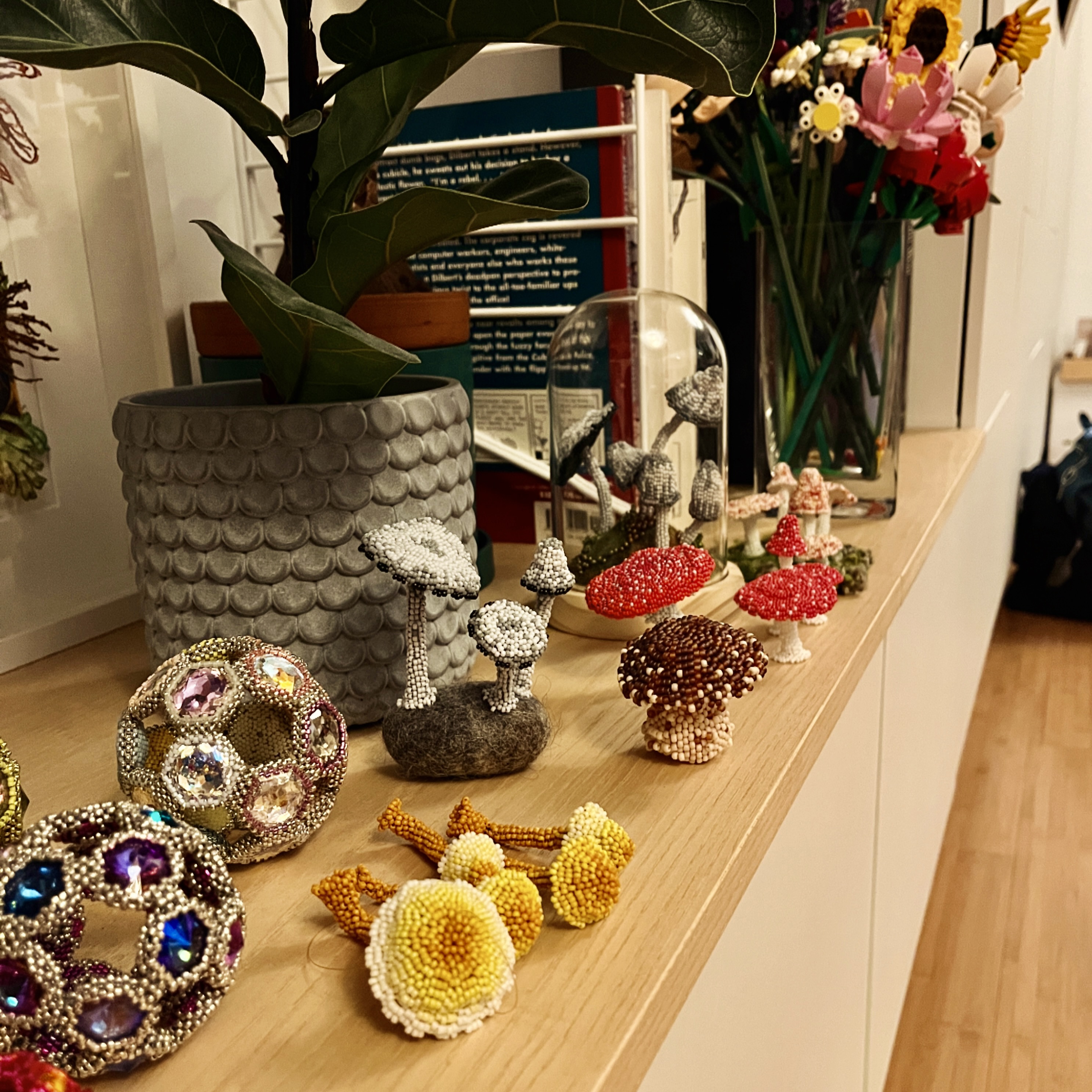 As you can see from the collection on display here with a couple of my Orbits, I’ve now made quite a lot of these, and the range is still growing. In the foreground here you can see my ombre yellow ‘cone’ samples from the tutorial – Sulphur Tufts. I’m now making a couple more of these and am working on introducing bends into the stalks to allow them to be mounted on a vertical surface, as if growing from a cut log in the wild. More on that soon.
