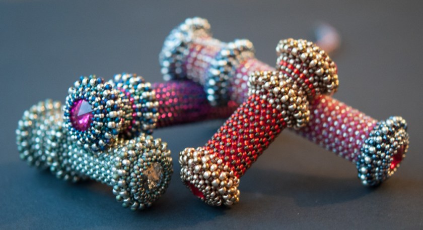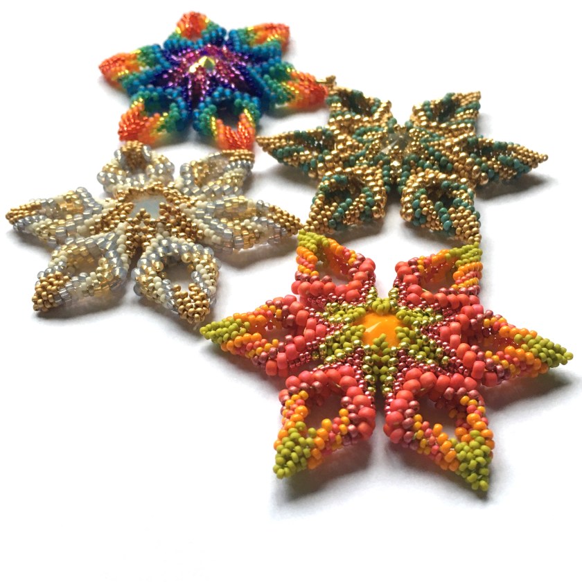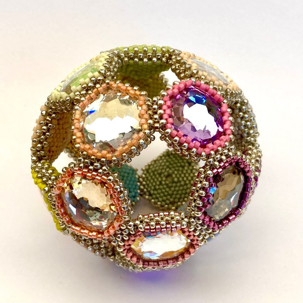 Using Angle Weave you’ll learn how to bead basic self supporting dodecahedra, and then over a series of 5 further lessons, add new techniques and thread paths to create rigid double layered and embellished versions. You’ll also be give recipes and tips for creating more combinations using the skills you’ll have mastered. You’ll need to be an Advanced beader, experienced with RAW and CRAW/PRAW, with good tension control (consistently able to vary from soft to medium to tight as instructed), and experience with following complex instructions for 3D layered beadwork.