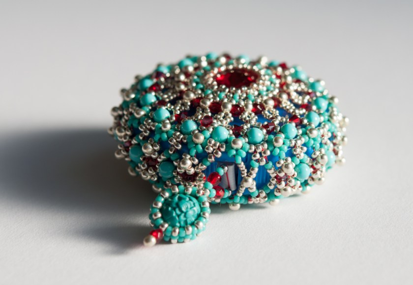 A ball of Czech spike beads or Czech gumdrops, held in place by a network of seed beads and Czech fire polished beads. The beaded ball is hollow and self supporting, and can be beaded in a couple of hours by a confident intermediate beader using Netting and Modified Right Angle Weave. This beaded bead forms one of a series of pieces which I made for a project called ‘Beading Beaded Beads’ which you can read about here.