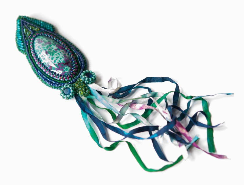 A tutorial for my Squidy pendant or hanging ornament. It uses a variety of bead embroidery, beadweaving and goldwork embroidery techniques, including back stitch, bezelling using circular peyote, seeding, right angle weave bezelling, goldwork and beaded edging to make a statement pendant, brooch or even a beautiful ornament. Will suit intermediate bead weavers or bead embroiderers, or experienced embroiderers looking to learn some beadweaving techniques.