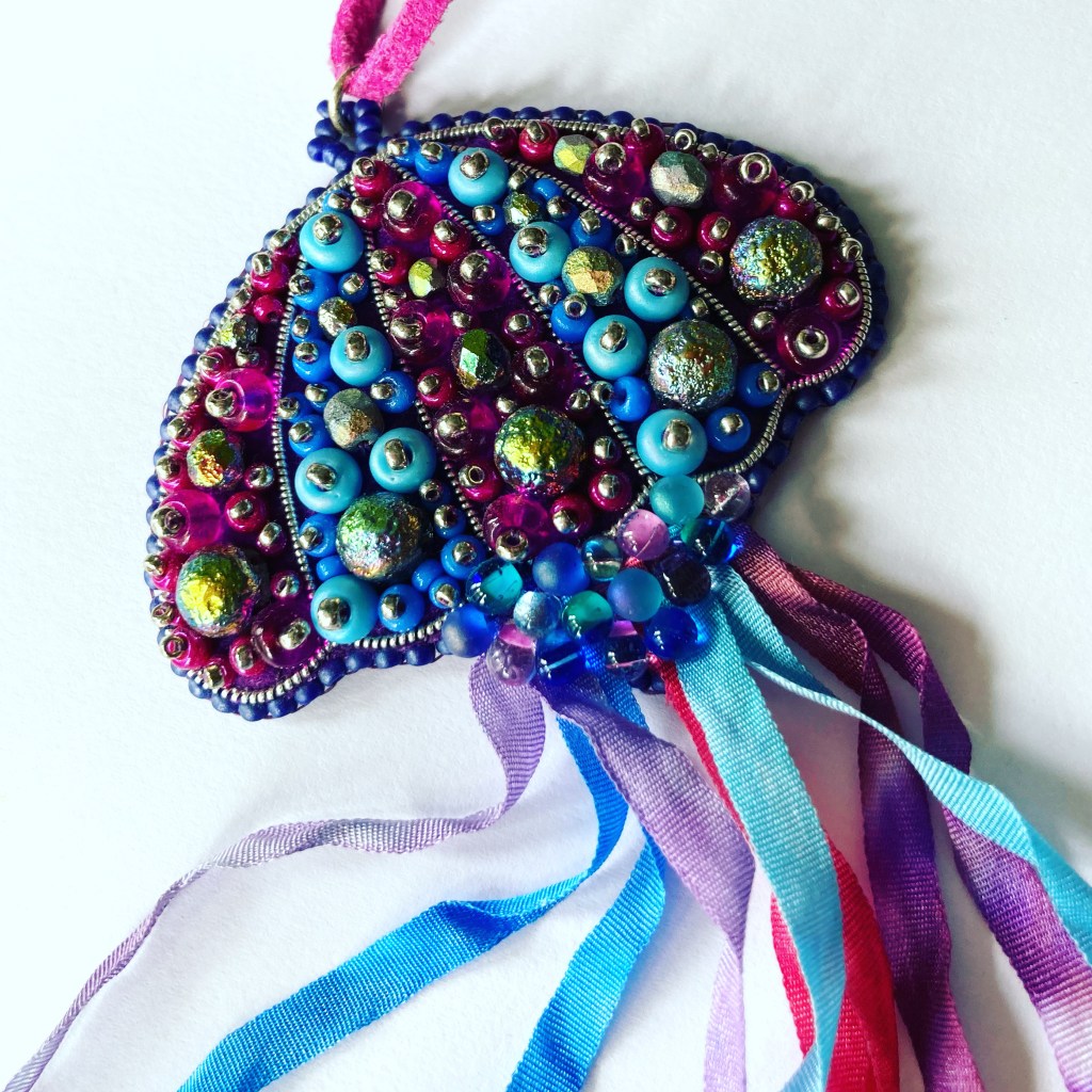 A tutorial for my Jelly pendant, brooch or hanging ornament. It uses a variety of bead embroidery and goldwork embroidery techniques, including seeding, stacking, goldwork (or optional back stitch beads) and beaded edging to make a statement pendant, brooch or even a beautiful ornament. Will suit intermediate bead embroiderers, or experienced embroiderers looking to learn some bead embroidery techniques.