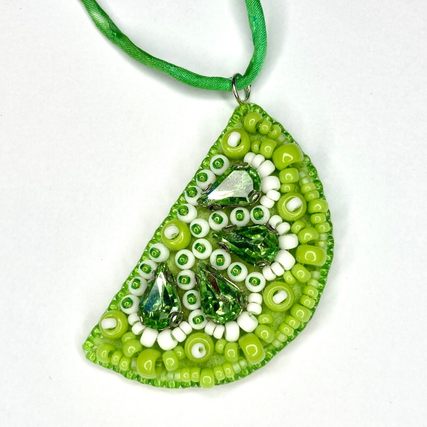 Ice and a Slice celebrates our love of Gin and Tonic with a variety of fruit adornments, each altering the flavour. It’s a bead embroidered component in three sizes which can be used separately or together to make a Pendant, Necklace, Brooch, Earrings or Ornament. It uses a variety of bead embroidery embroidery techniques with optional goldwork, and will suit intermediate bead weavers, bead embroiderers, or embroiderers looking to learn some bead embroidery techniques.