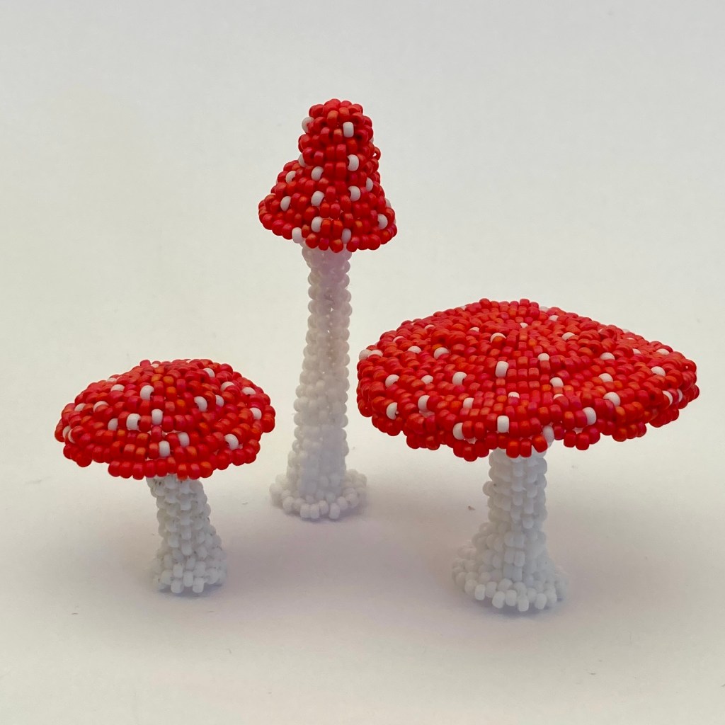Launched for Halloween 2025 – a trio of 3D peyote stitched mushrooms, for advanced beaders. This piece uses circular and tubular peyote to beadweave three shapes and sizes of mushrooms entirely in size 11 seed beads.