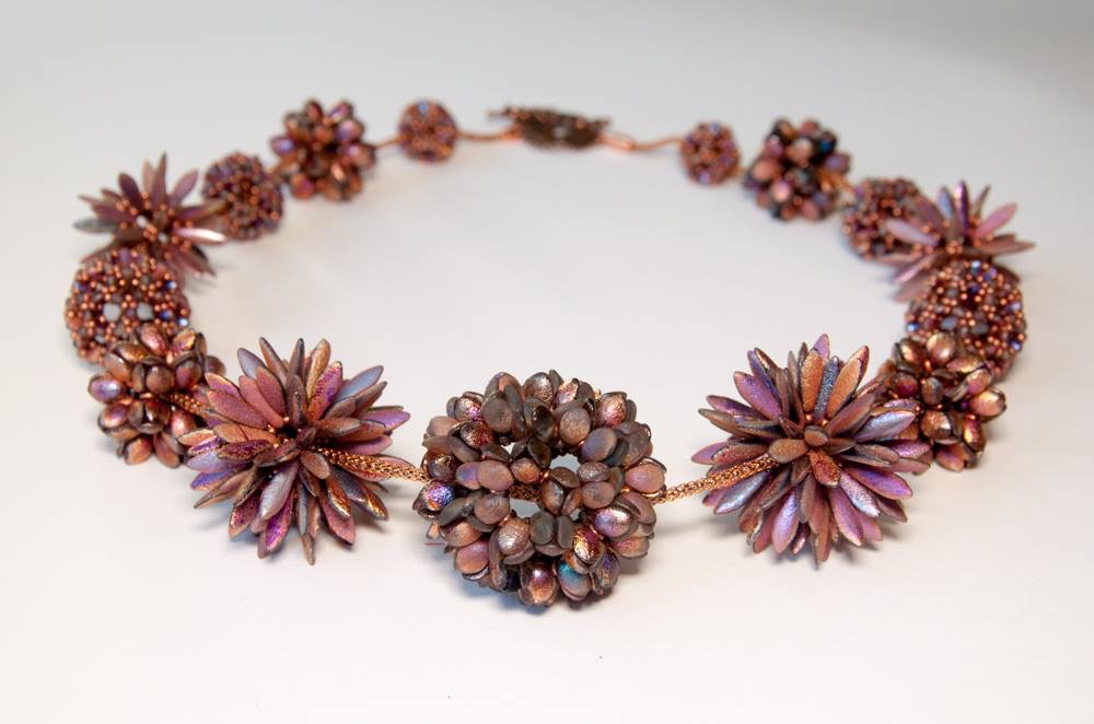 Then I started working with etched beads more, and at the same time, buying wholesale for my Materials Packs. I treated myself to packs of all sorts of Etched Slipperit beads in different shapes as this was my favourite finish at the time, and suddenly found myself with big enough bags to really delve and experiment. I tried different feature beads such as the Tulip Petals, and even 2 holed daggers (sometimes with single holed ones too for extra daftness) and at last something more interesting seemed to be coming.