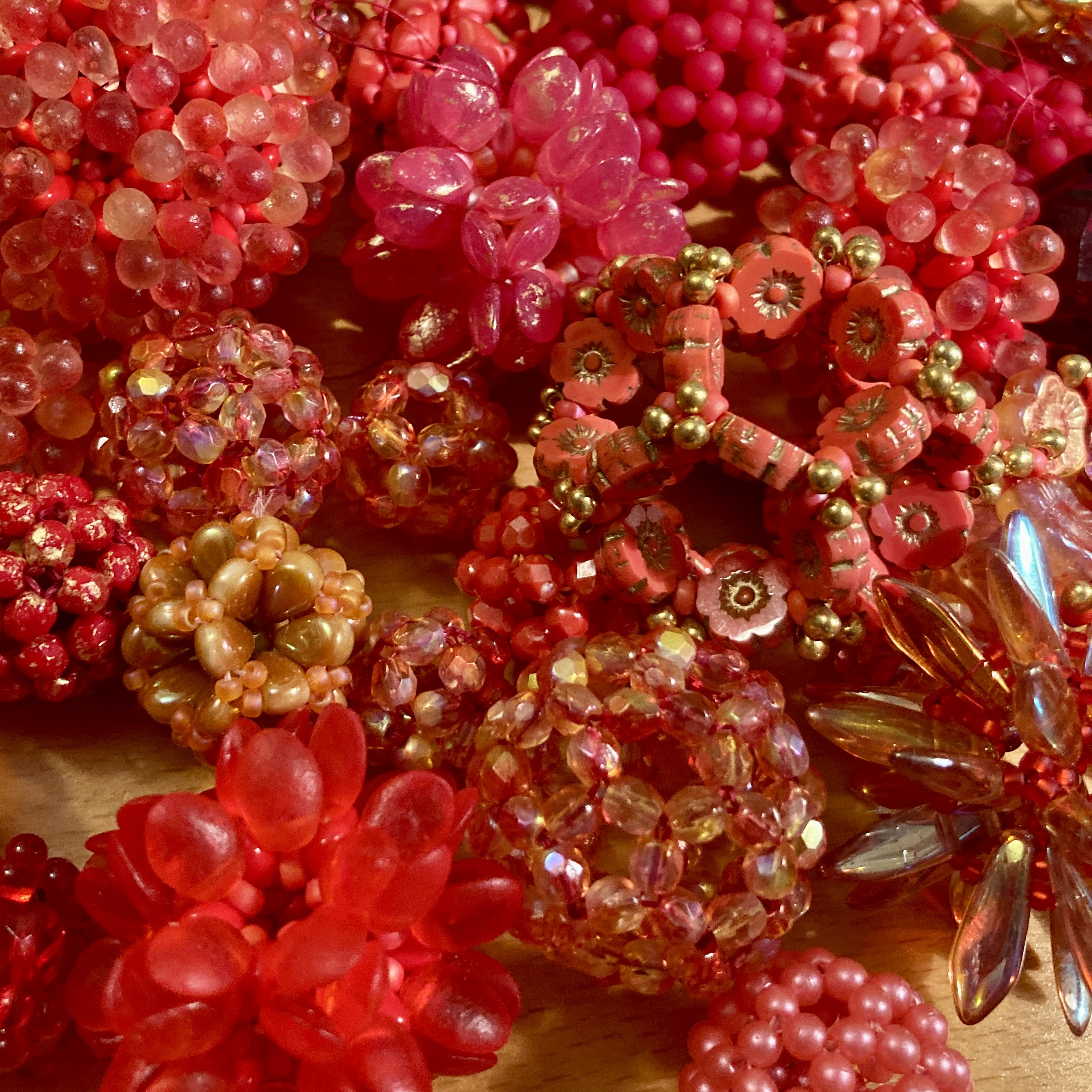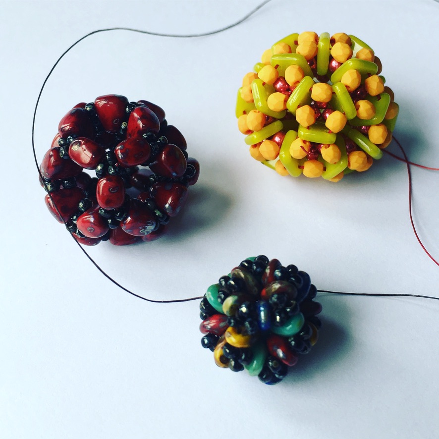 Earlier this year I started making a set of beaded beads. I love beaded beads, they’re something I come back to time and time again when I need a beaded piece for an outfit, when I’m stuck creatively, or when I want to really dig into some new 3D techniques and ideas. I went back to geometric solids and started playing with some methods and ideas I’ve been back and forth with over many years. I was trying to put together ’99 Red Balloons’ for a competition (Bead a Song) – that didn’t work out (I’ll tell you what did another day) but returning to such a versatile method made me realise I needed to get this one published and out of my system.
