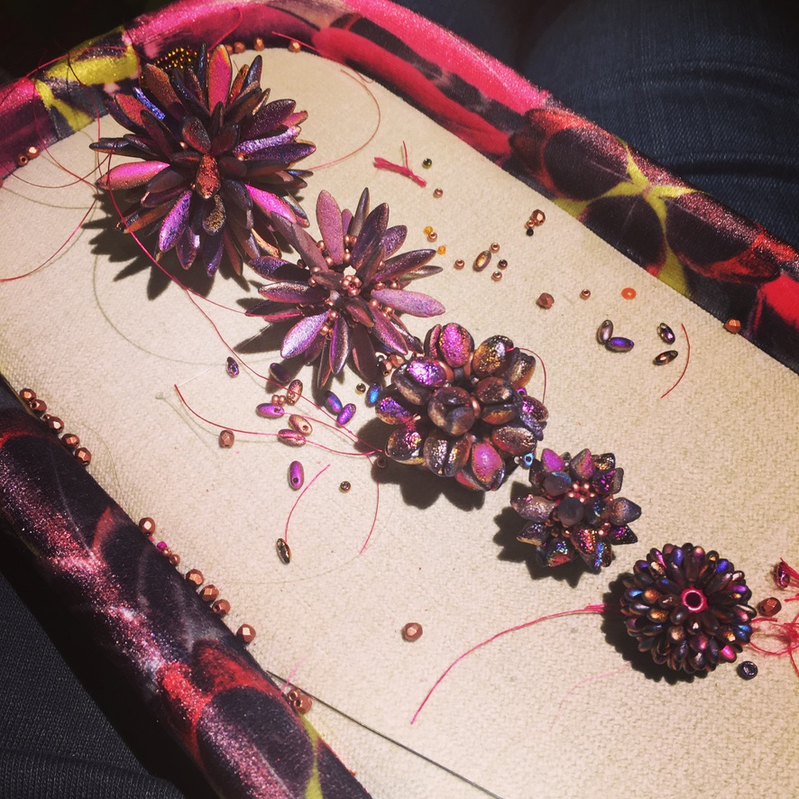 After all that fiddling and frogging I had a breakthrough, managing to come up with a cunning trick to improve the thread path at a critical point to save needles, remove the need to weave through to strengthen and best of all, preventing bad language! Ironically the diversions were all red herrings – the final piece is very close to the two first Cellini versions, just with that slight critical adjustment. Brighter colours to help with picture taking at this stage……