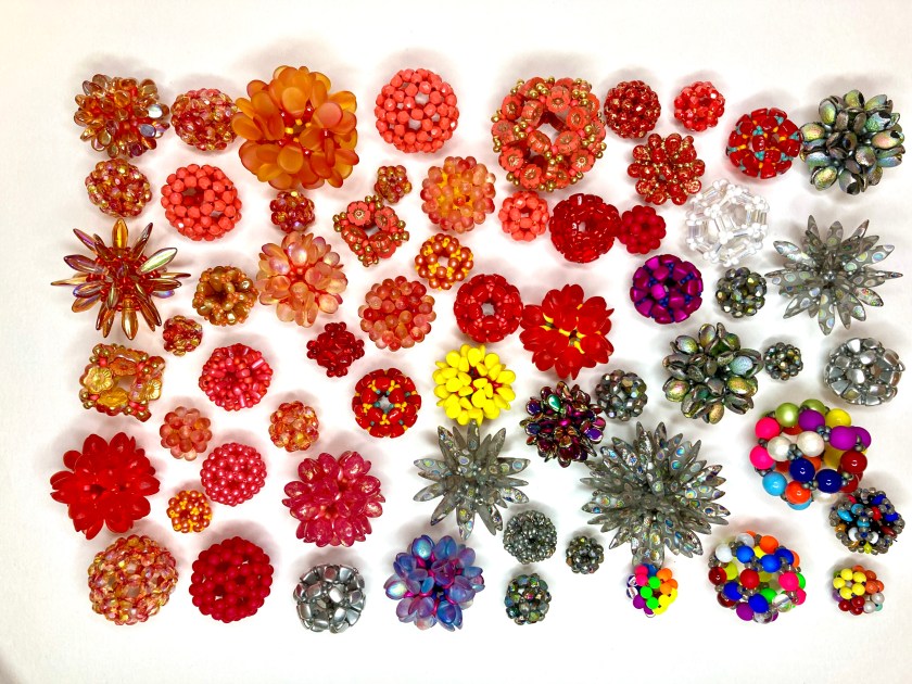 Fast forward to this year and the 99 Red Balloons. I made about 44, decided I would go mad if I made 99, and also that the song itself, being about accidental nuclear war probably wasn’t best represented in a long string of jolly red beaded beads (however much I tried to play up the ‘atomic’ structure). I made my competition piece about a completely different song, using completely different techniques and colours, and then once that was posted looked at the huge pile of red, pink and orange beaded beads and thought ‘hmmmmm….I love these so much, I’m so proud of them that I want to show them off, and I have all these extra combinations now – is now the time to make myself work this through?’