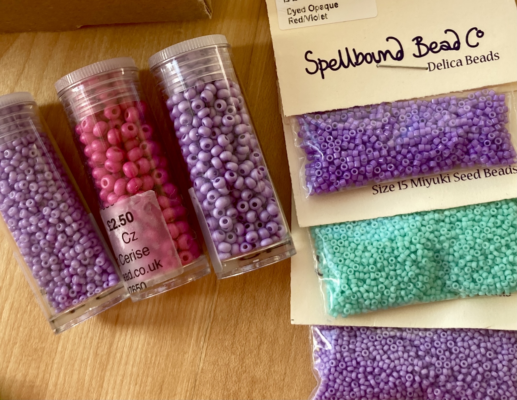 So, a tiny bead haul from Spellbound Beads (let’s be honest, I already have enough beads). I seem to be obsessed with using lilac and lavender as highlight colours at the moment and as I’ve never really used them before I need to build up a bit of a stash there. And obviously I like to support bead shops. Those are my excuses.