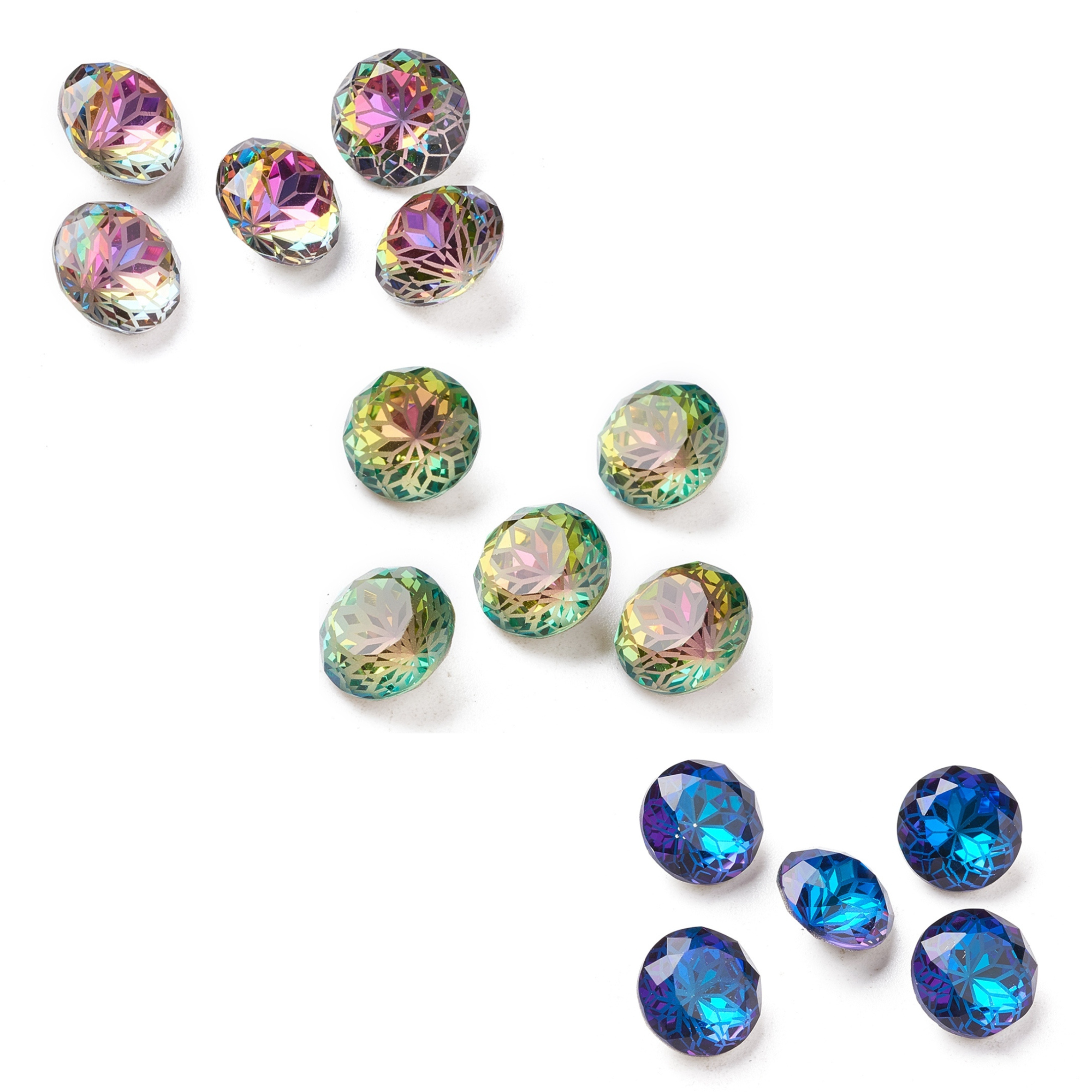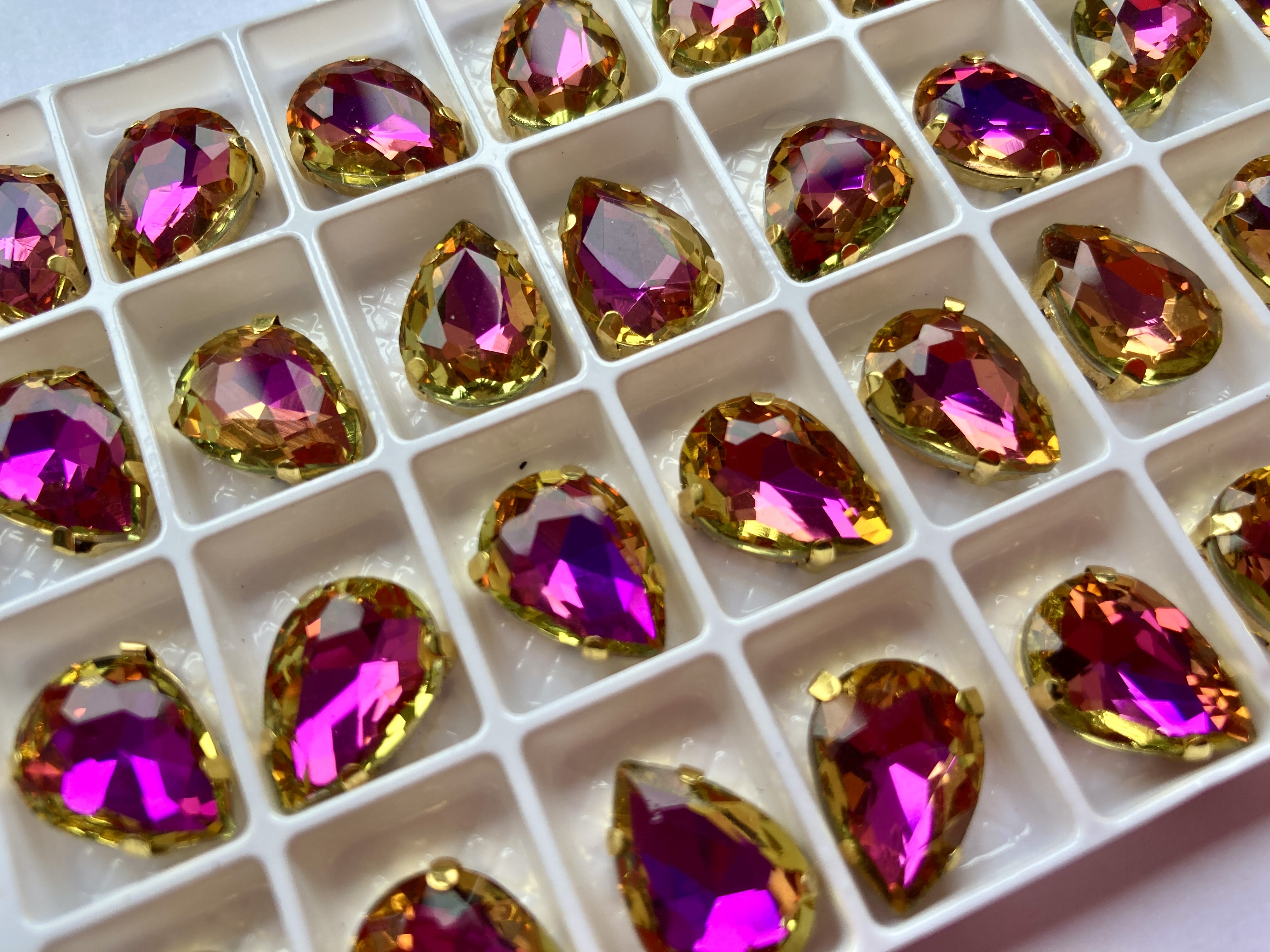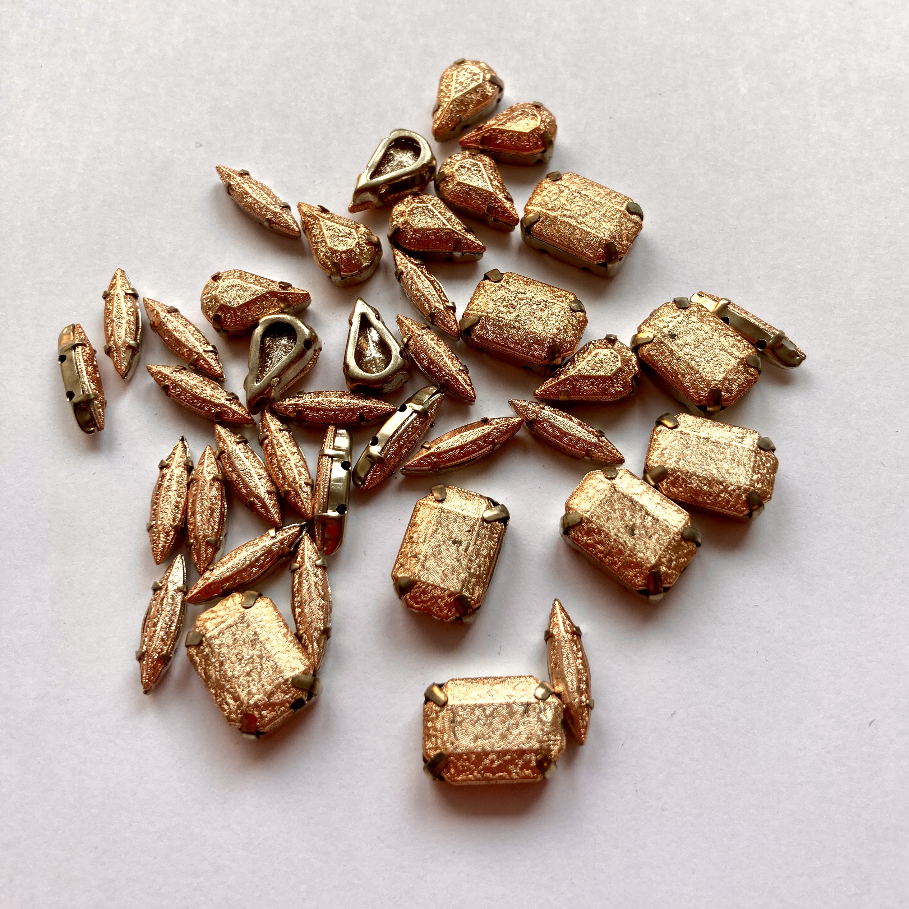 Or if you’re an embroiderer or bead embroiderer I now have a selection of crystals in sew on settings – either pear shapes in glass crystals (more colours coming soon), or for a more unusual finish these new Indian acrylic stones in a variety of shapes. I wouldn’t normally use an acrylic stone but the textured metallic finish on these is irresistible.
