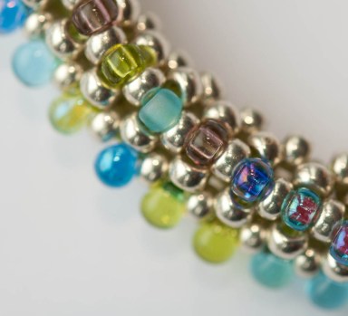 A deep turquoise rivoli crystal encased in aubergine crystals and gold seed beads, hanging from a gold plated chain.