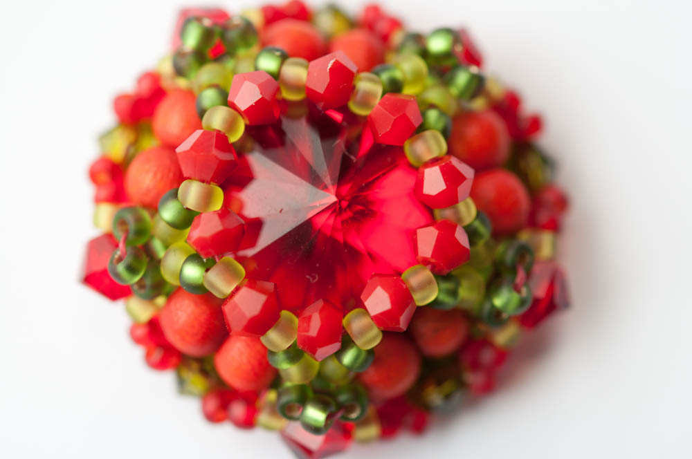 Adapted from Sabine’s design to use a smaller (14mm) rivoli, and smaller, wooden round beads.