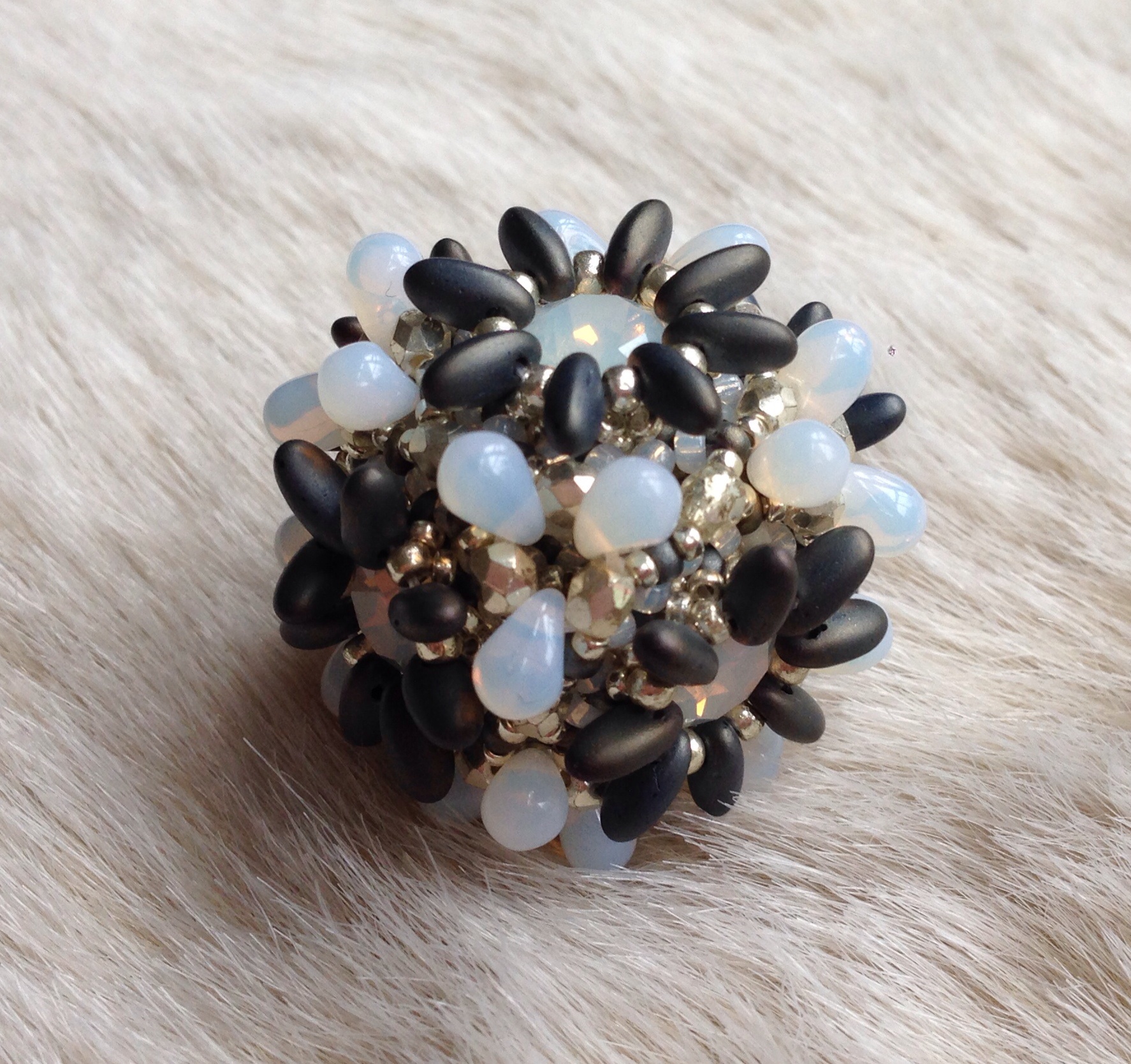 I’ve had my electronic copy of Contemporary Geometric Beadwork 2 for a few weeks now, and with the bigger boy at school at last I felt I had the time and energy to have a go at another piece. One of the loveliest pieces in book 1 was the Fortuneteller, and with lots of lovely examples in book 2 I felt inspired. It’s gone together very nicely (they really are deceptively simple designs in the end) and I’m really rather pleased with it.