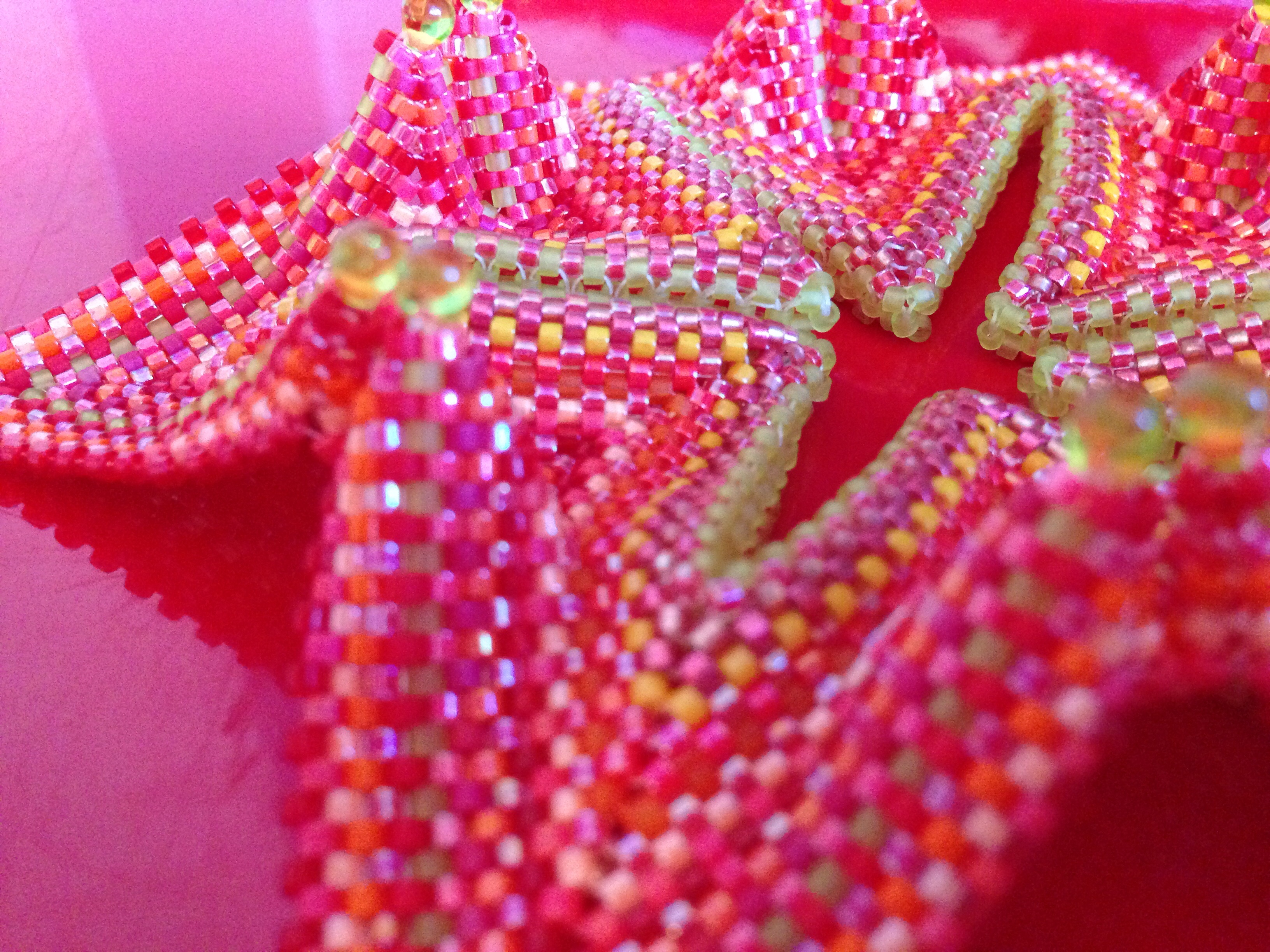29g of delicas in around 15 different shades of salmon, red, orange, peach, yellow and pink, including luminous, mattes, metallics and transparents. 24 Miyuki drops (various colours, taken from a mix).