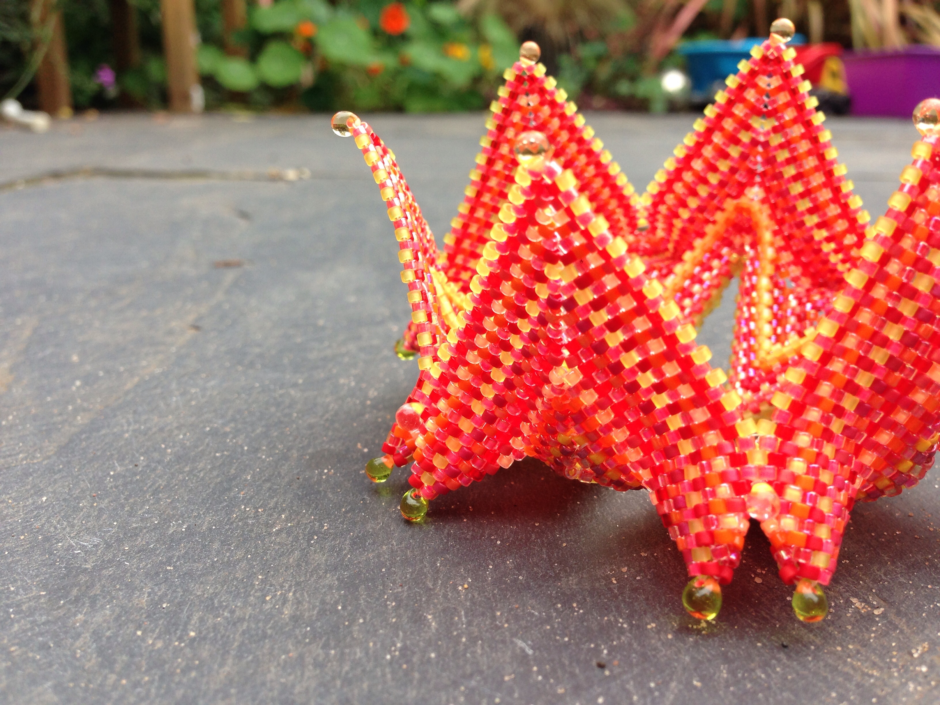 I used a variety of shades of red, orange, salmon and peach delicas, including two of the newish luminous colours. In natural light the finished piece is very bright, but the yellow tones of artificial light do quieten it a bit. Apologies for the failure to take photos in progress, but I don’t get much chance to get at my beads in daylight……