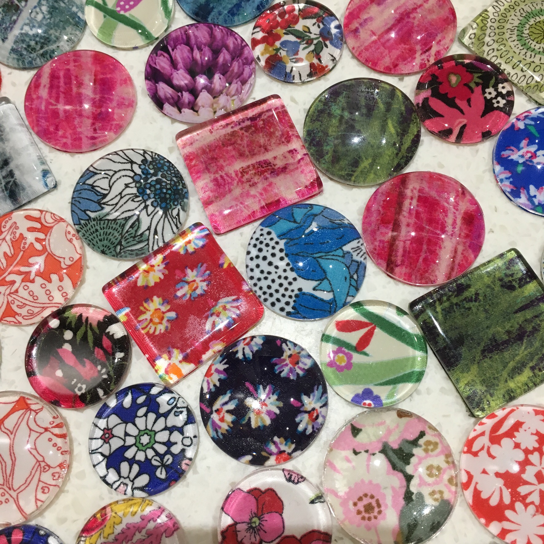 Those of you that follow me on Facebook or Instagram will know that recently I’ve been playing with Pebeo paints and Liberty fabrics to make my own cabochons.  It’s been an interesting diversion, and it’s still got a way to run as I hone the processes and get used to the paints.  It’s quite satisfying to be able to sit down and play with colours so quickly, never quite knowing how they will turn out but not having had to commit too much time.  I’ve had to try lots of different processes and materials, and source a whole new set of supplies, and now I’m getting good results I’m even beginning to use the finished cabs in my beadwork.