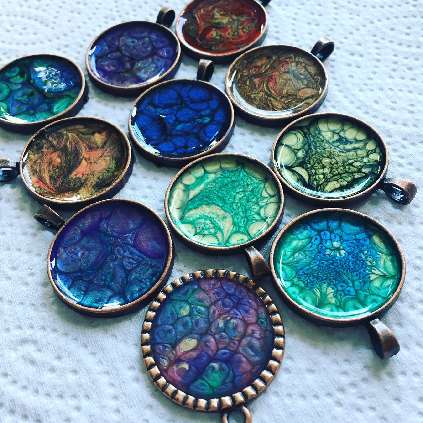 Because these are all made using water based paints I won’t be selling them as I’m concerned about their durability in wear (although I am making things for me with them!) but panic not, because I’ve moved onto doing mini pours with actual acrylic paints, which are waterproof when dry, so will (hopefully) lead to some saleable versions. I say lead to as this is a whole new technique, with a new set of challenges, particularly around colour selection, so I’ve got a way to go. It took a year to get the Pebeo method right, so it may be a while, but it’s fun trying.