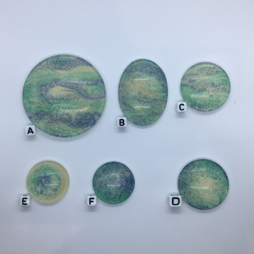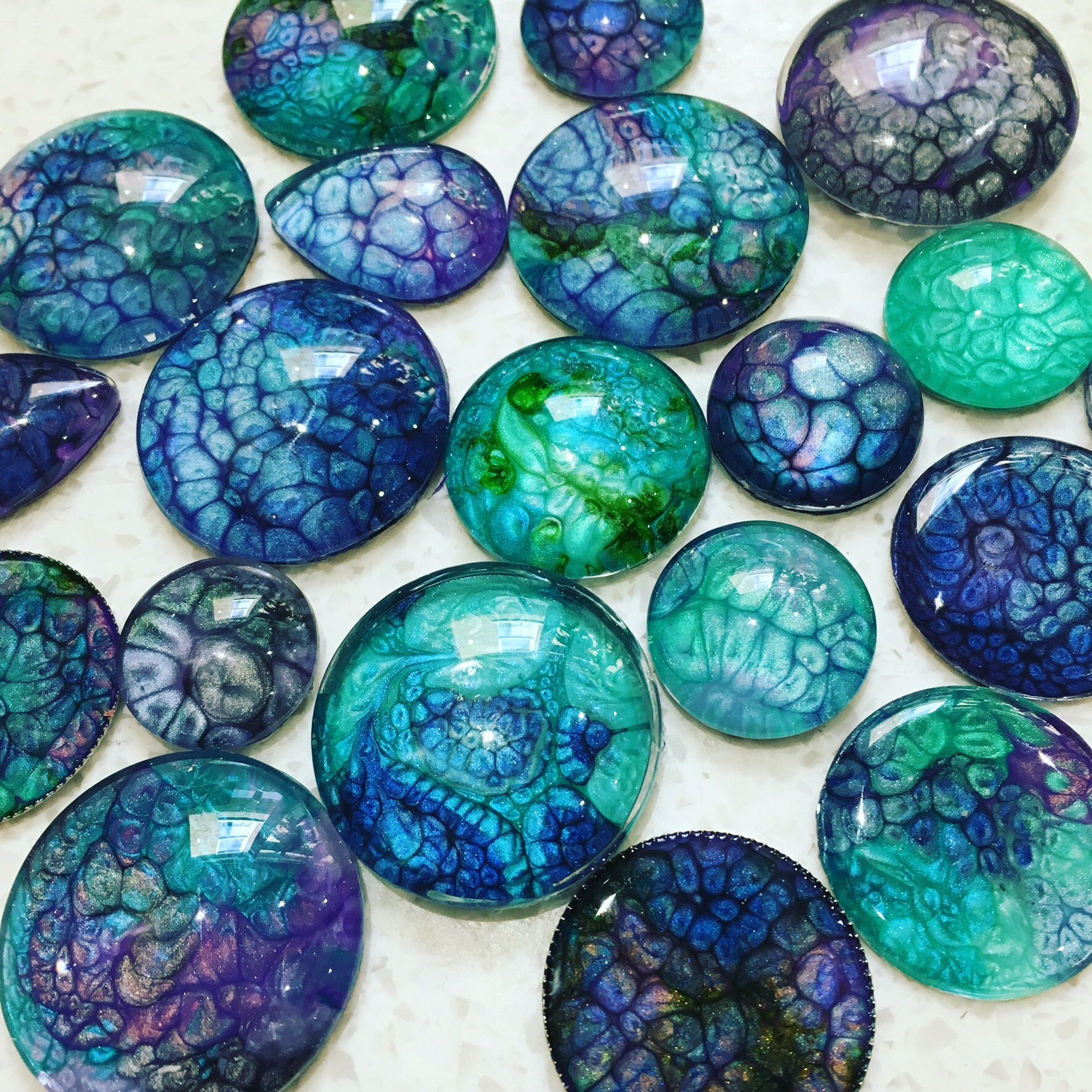 So I’ve been playing again on the cabochon front. A chance discovery during a session of poster paint salad spinner painting with my youngest (google it) led to a very painterly set using the run off which reminded me of Monet’s Water Lilies.