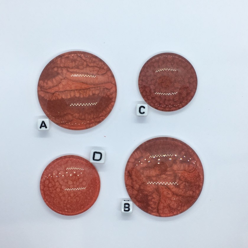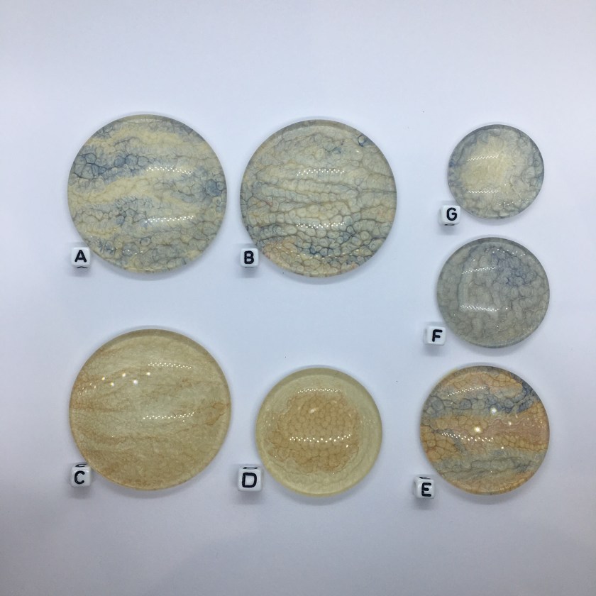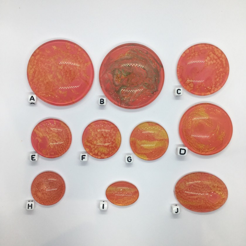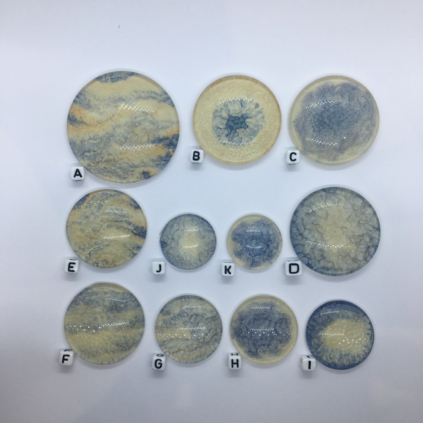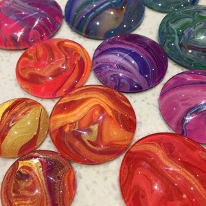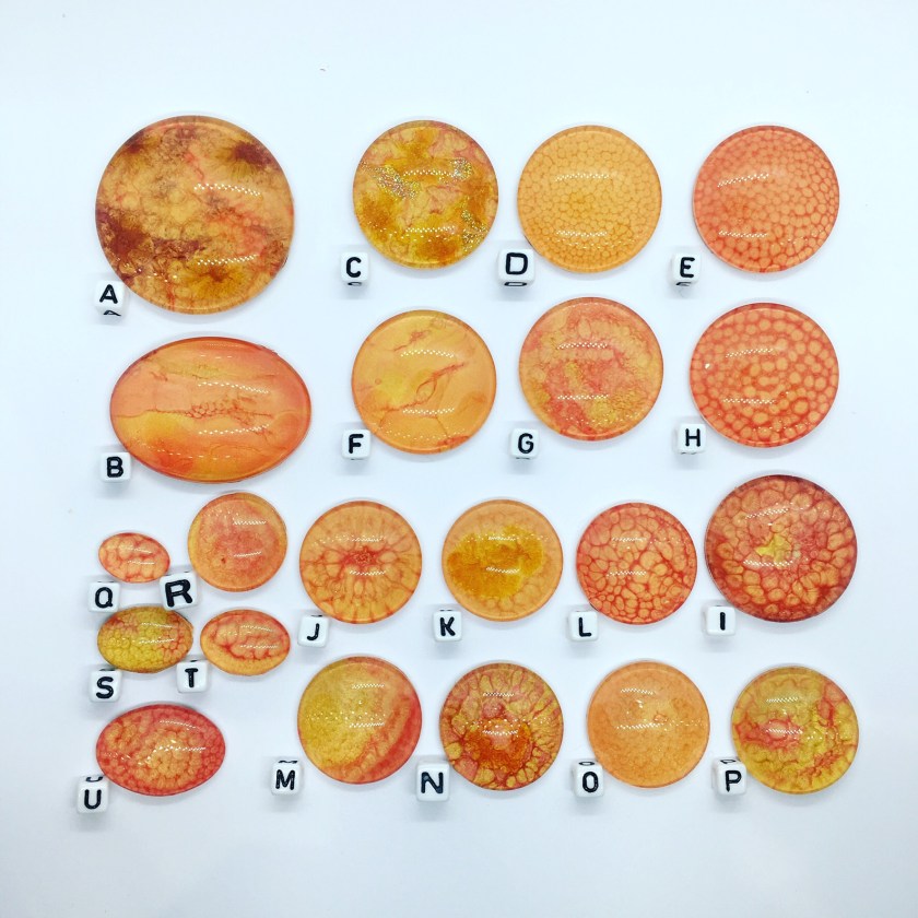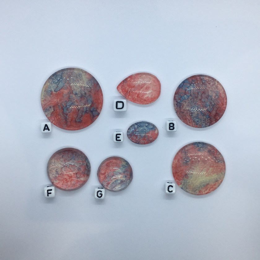 Digging around I found a set of experimental cabs that I made in the early days using the left over paint mess from a salad spinner painting session with the boys.  Surreal but true.  The drips and dribbles gave an acrylic pour effect, and I’d even tried mopping up the excess paint from the side of the spinner by blotting, giving a lovely blotchy effect which I’d then used to make a huge 50mm cab.