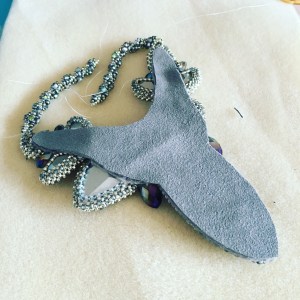 While this was going on I backed the main piece – I wanted to secure the ropes to both the bezelled crystals and the backing first, and then I decided to order some grey rather than using the black ultrasuede I already had – I think it was worth the wait.  That then allowed me to edge – I had planned an extravagent fancy edge, but once I’d put the first brick stitch edge in place that felt like enough for now.