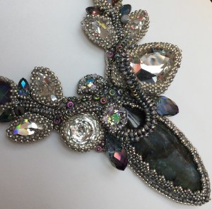 Grouped together the bezelled crystals didn’t seem big enough to occupy the very deep V shaped neckline of the wrap style dress, so I had a root around and found a huge labradorite cabochon.  I mounted that on some grey Nicole’s Bead Backing, and cut a rough shape, adding wings at the top to join to the crystals. I bezelled using back stitch and then peyote, alternating bead and no bead on the final row for textural interest.  A back stitched row of tiny 2mm etched granite fire polished beads finished that part.