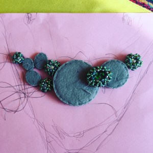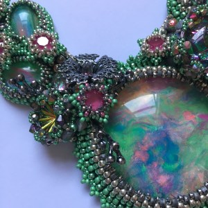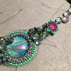 Whilst I was thinking (OK procrastinating) the theme was announced for another competition that fit my nearly complete piece perfectly.  In every other way that competition seemed like a better fit for it, so I decided to enter something else at Stitch and Craft instead – another one of my big bead embroidered necklaces perhaps, using beads that were definitely from them and some of my own cabochons?