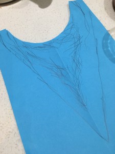 Next I had to decide how to put the piece together. Because I was making for one very specific occasion, and one dress I wanted to use the shape of the dress to really enhance the piece. So amid much laughter from my long suffering husband I cut a section out of a piece of A4 paper to leave room for my neck, then stuffed it into the front of the dress and drew the outline of the dress’s neckline onto the paper. I also added a rough sketch of what I though the ideal shape would be – following the lines of the dress but giving a gap so that the piece would be nicely fitted and framed – giving me a probable outline and an idea of the space I would be working with in case that outline had to evolve.