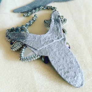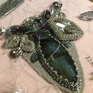 Grouped together the bezelled crystals didn’t seem big enough to occupy the very deep V shaped neckline of the wrap style dress, so I had a root around and found a huge labradorite cabochon. I mounted that on some grey Nicole’s Bead Backing, and cut a rough shape, adding wings at the top to join to the crystals. I bezelled using back stitch and then peyote, alternating bead and no bead on the final row for textural interest. A back stitched row of tiny 2mm etched granite fire polished beads finished that part.