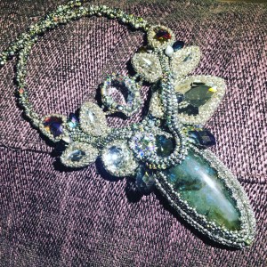 Next I covered some of the backing and added some edge interest by stitching on some faceted drops – I had bought these a while back and they seemed to pick out the blues and purples in the labradorite. Then things seemed to be getting a bit too flat, so I wanted to add some height – I beaded some herringbone rope which I nestled between the asymetric crystals (they were starting to look a bit like leaves) and then twisted and twined above the central stones – again using etched vitrail, with 8s in the central section and 11s either end to nestle into the gaps. A couple of matte vitrail etched spikes filled in some more gaps and gave more textural interest, and a gorgeous waterlilly chaton with a rather risky minimal bezel broke up the rope a bit.