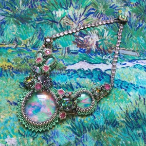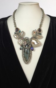 That would be why you’re always told to start new threads to do attachments – makes it much easier to simply change your mind! That left me with a rather boring top edge to the central area, so another bezelled chaton attached at an angle broke that up nicely, and hey presto ‘Diva’ (what else could you call a necklace for a soprano) was complete.