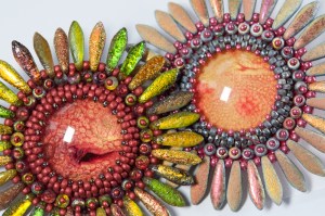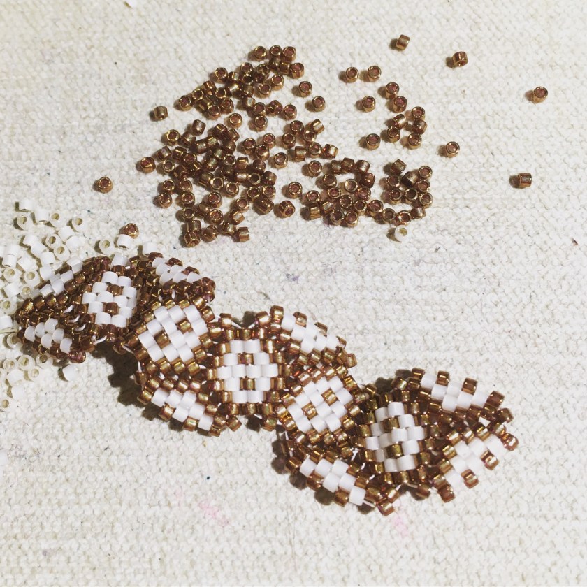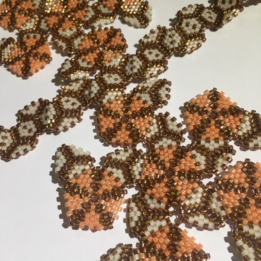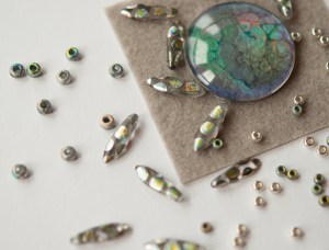 I used stacking (one large bead caught down and through with a smaller bead – in this case a mix of 8s and 6s caught with 11s) to fill in the remaining backing – again in the etched vitrail which looks absolutely amazing on the large 6 seeds, and then I was ready to think about a strap.