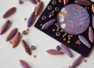 While this was going on I backed the main piece – I wanted to secure the ropes to both the bezelled crystals and the backing first, and then I decided to order some grey rather than using the black ultrasuede I already had – I think it was worth the wait. That then allowed me to edge – I had planned an extravagent fancy edge, but once I’d put the first brick stitch edge in place that felt like enough for now.
