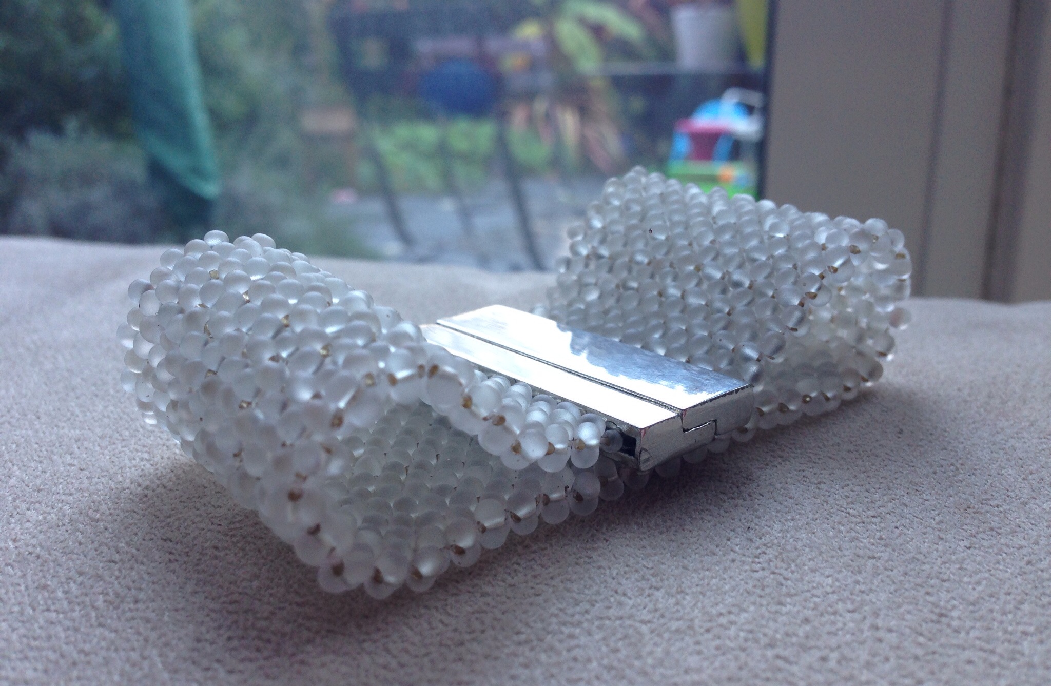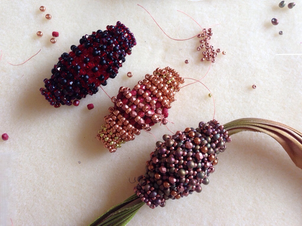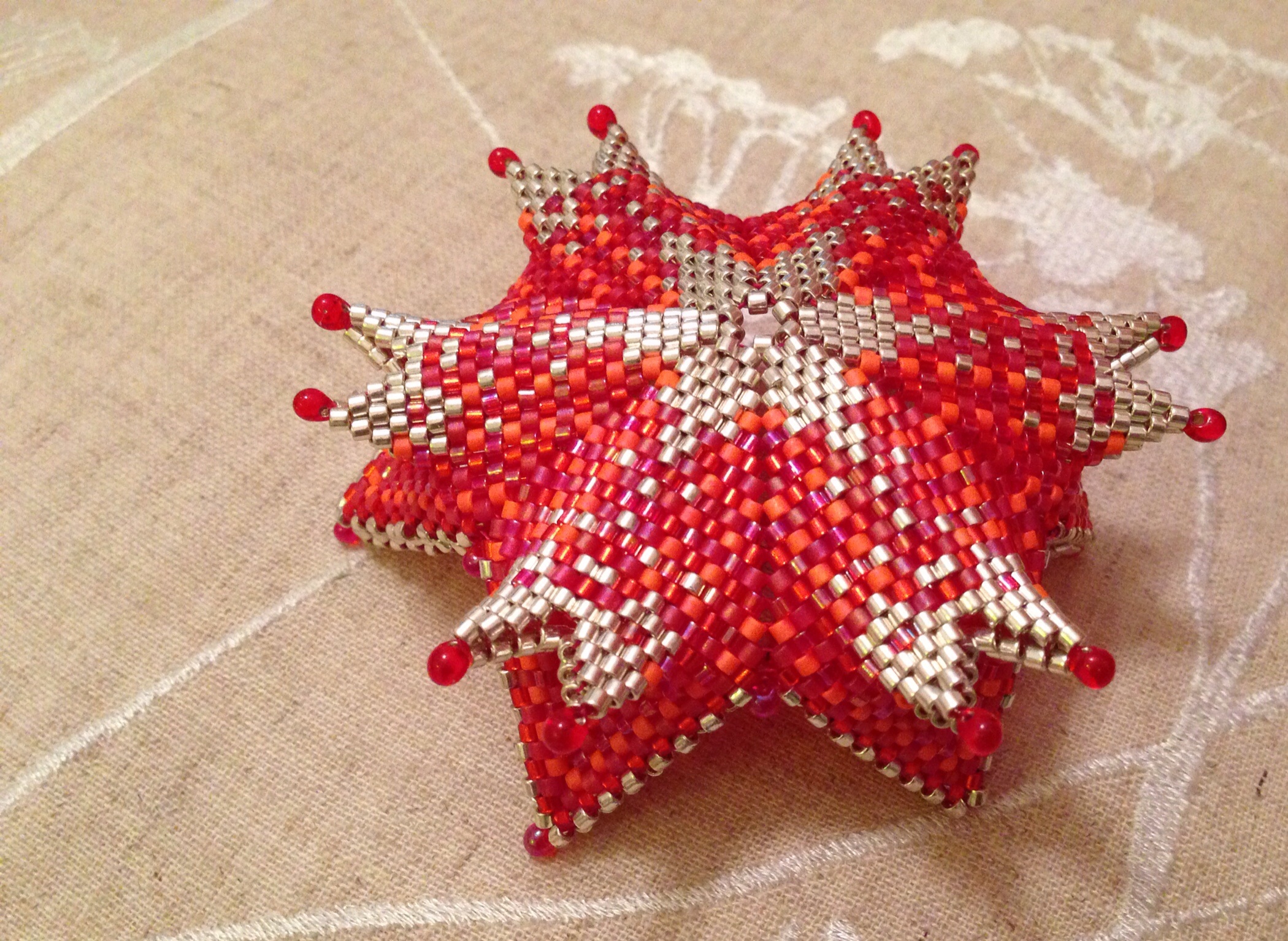 So a plan, but no way to see if I was right other than beading it, we departed for Christmas with 20 pots of pastel delicas and 20 hexagonal crystals. I doggedly beaded them half askeep in front of the post Christmas telly whilst the boys built Lego and played with my Dad’s train set, and by New Year I was relieved to see that my gamble had paid off, and Orbit was born.
