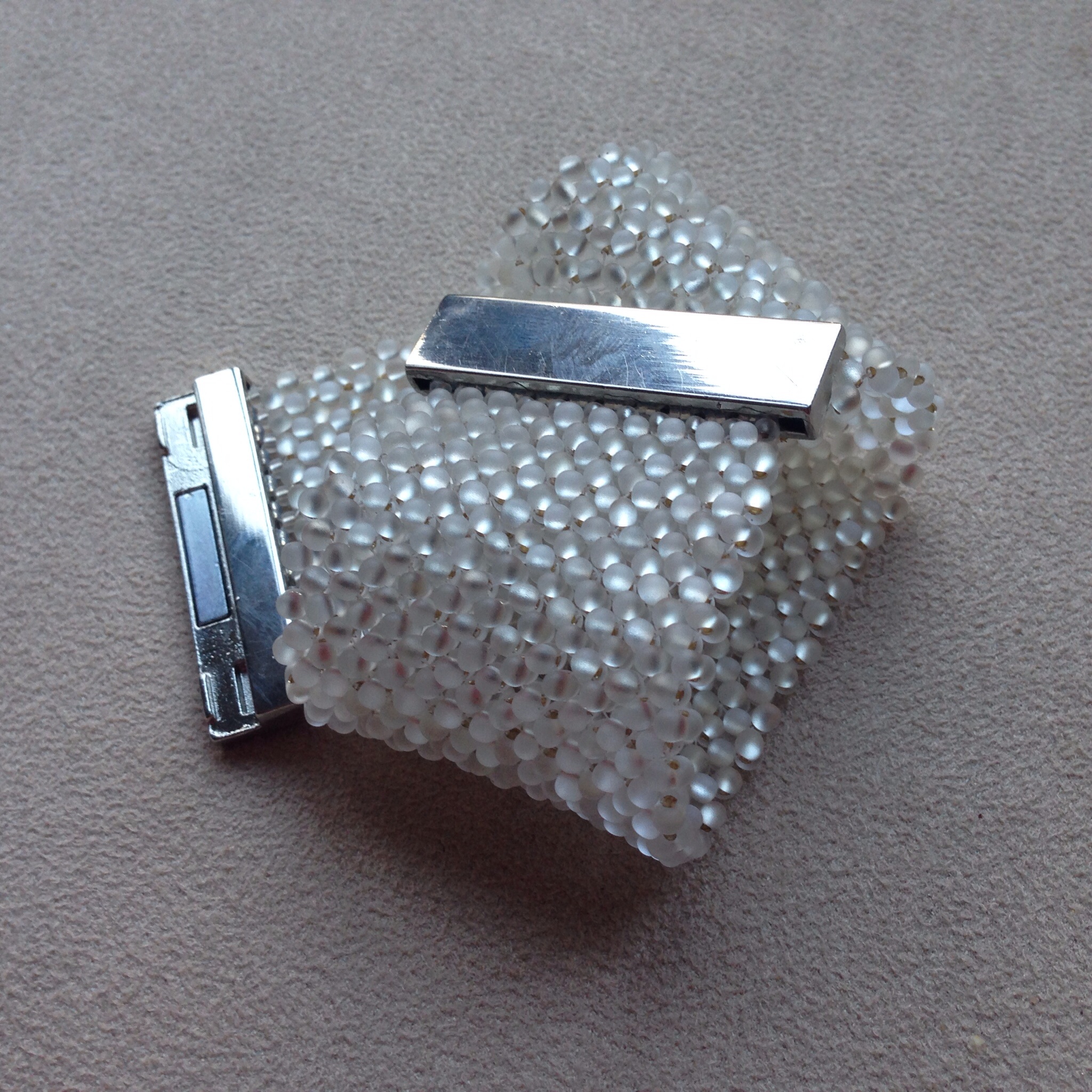 A few months later I was looking at them again, and had a go at my favourite MRAW bezel to see how best to start using them. I always try that first with new cyrstals, and if that fails try peyote combinations, and finally complex 3D netting. It worked, and made a lovely solid bezel (particularly when I used a hexagon on the backs), but when I joined it to another I couldn’t get it to sit flat – whatever combinations of beads and stitches I tried I could only get a nice finish that was either concave or convex.