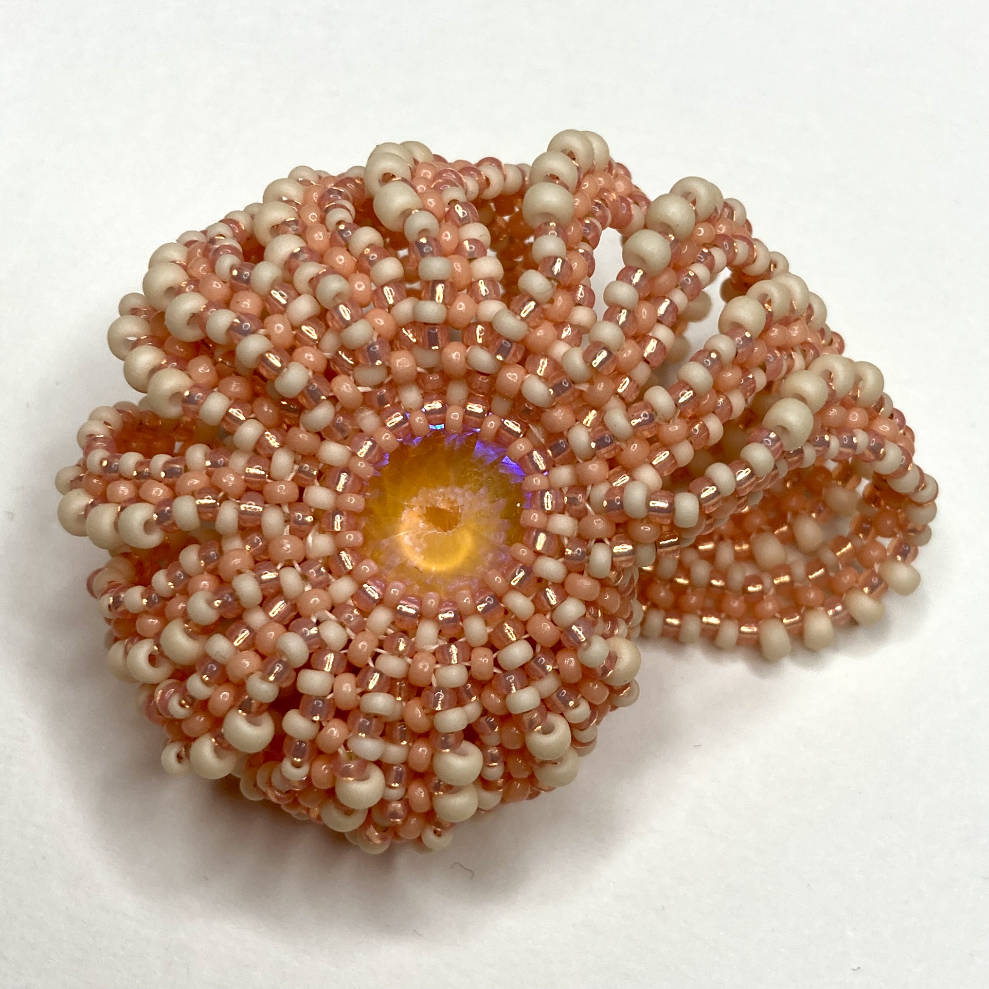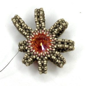 Next, a lone Swarovski 14mm crystal in my stash of the same shape and cut beckoned, and I managed to alter the bead count to get a bezel to work for that too. Crystal Idea in Lithuania had a good stock, so 19 more were ordered, and the Poppy variation followed.
