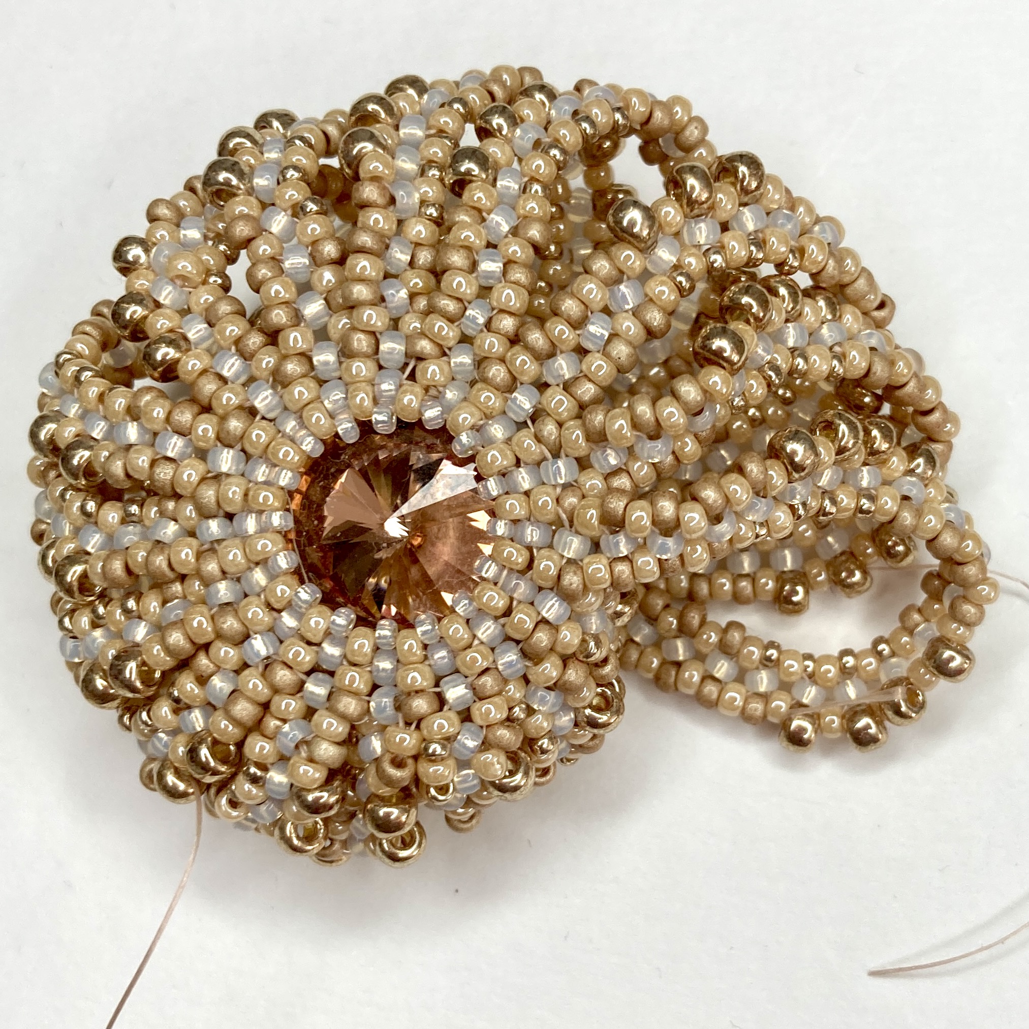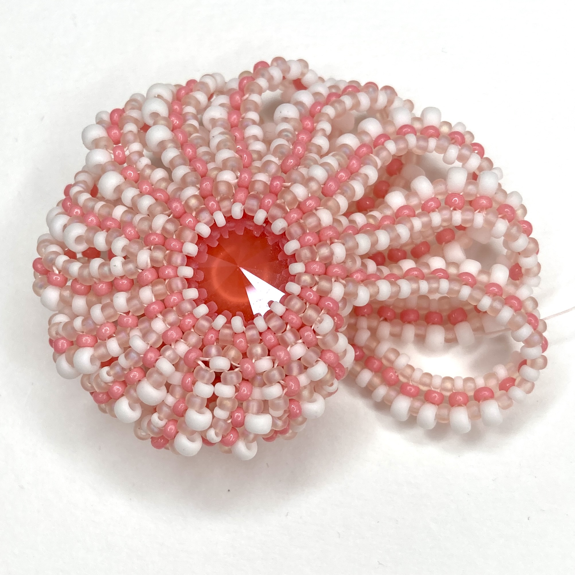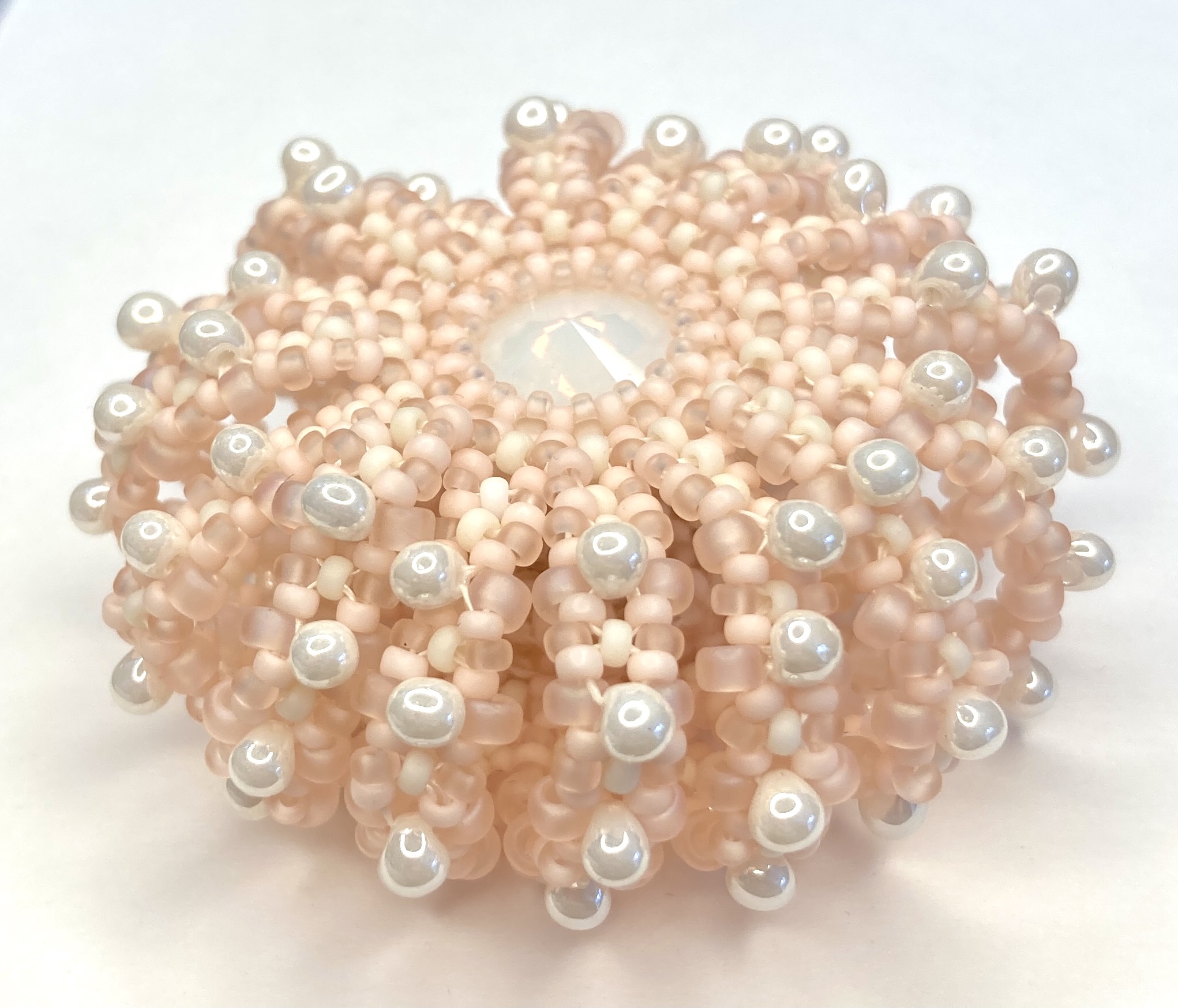 Along the way I made another plain version (no Cellini, but refined from the earlier plain versions), and after some useful comments on Instagram when I showed some in progress pieces, I added a baby variation using an 8mm chaton, and a Sea Urchin variation using the 14mm and some 3.4mm drops. These are in my favourite colour palettes for this piece – warm palest peachy pinks and soft creams or whites (very pretty and an indulgence after having to work with more distinctive colours for tutorial images).