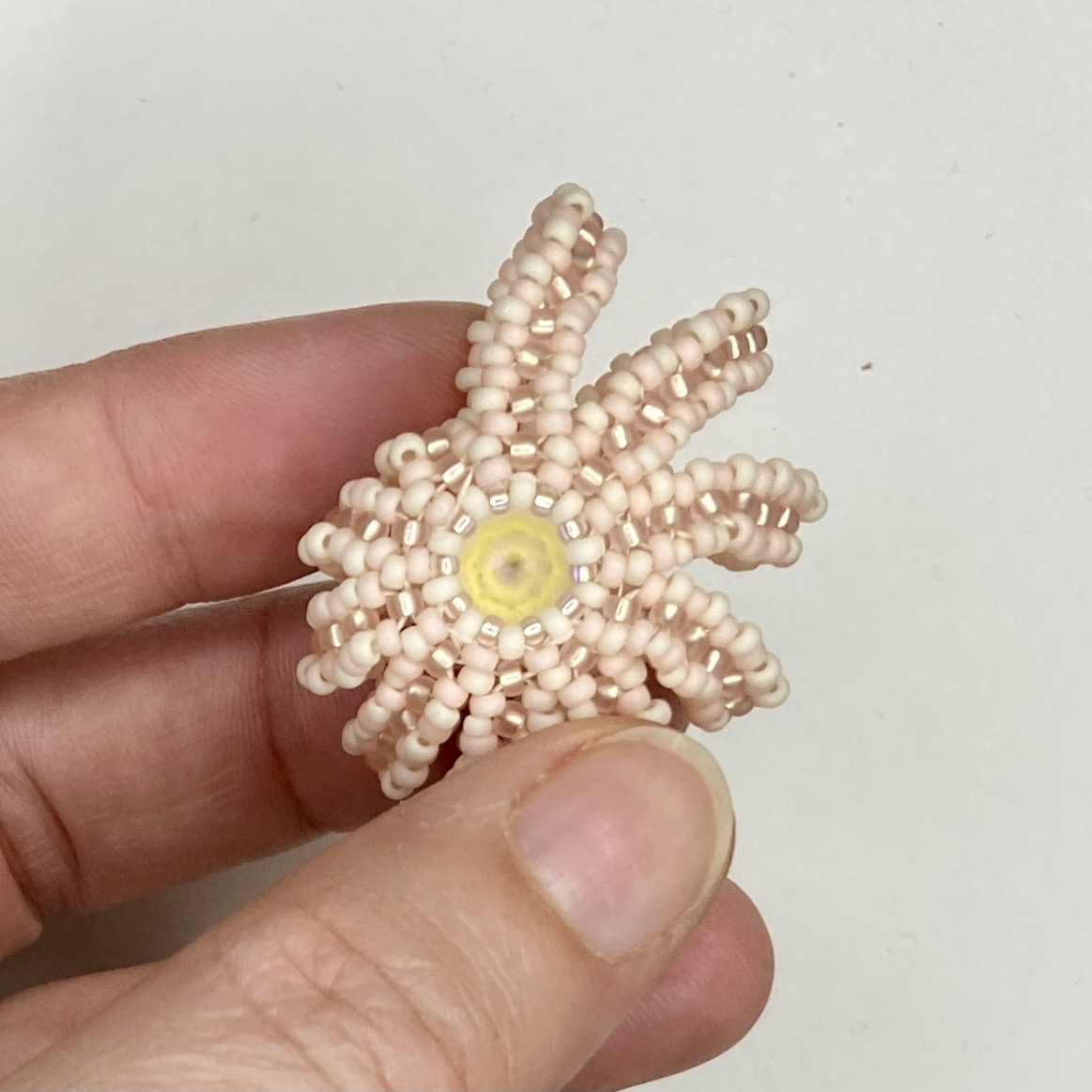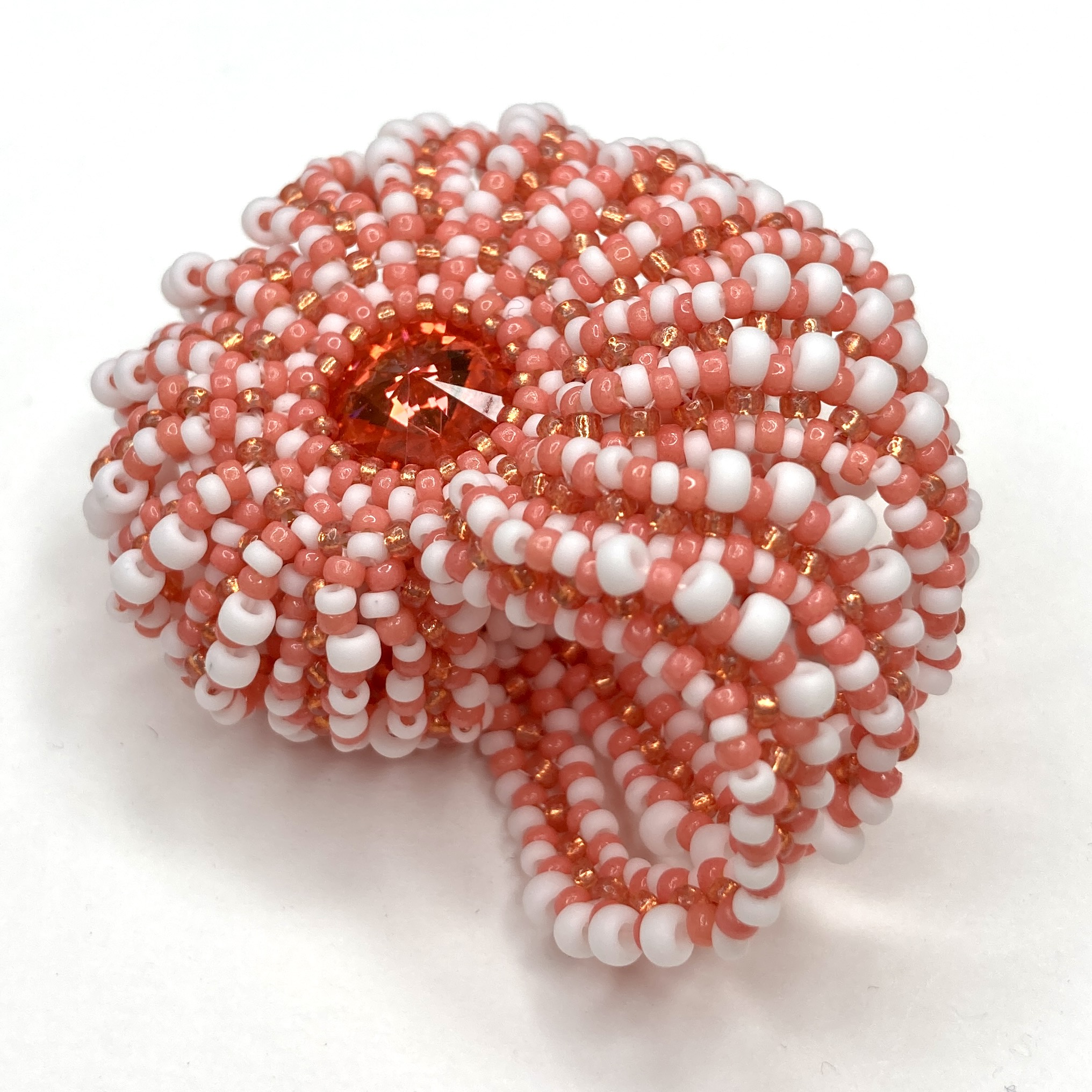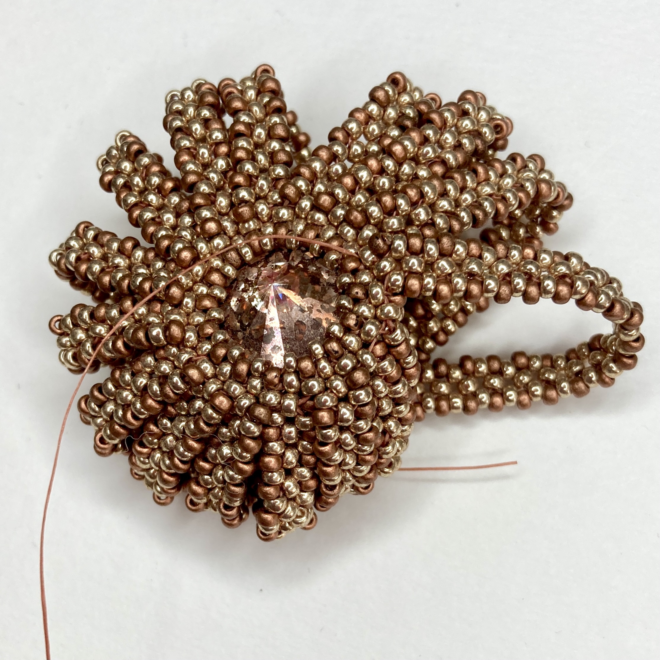 Along the way I made another plain version (no Cellini, but refined from the earlier plain versions), and after some useful comments on Instagram when I showed some in progress pieces, I added a baby variation using an 8mm chaton, and a Sea Urchin variation using the 14mm and some 3.4mm drops. These are in my favourite colour palettes for this piece – warm palest peachy pinks and soft creams or whites (very pretty and an indulgence after having to work with more distinctive colours for tutorial images).
