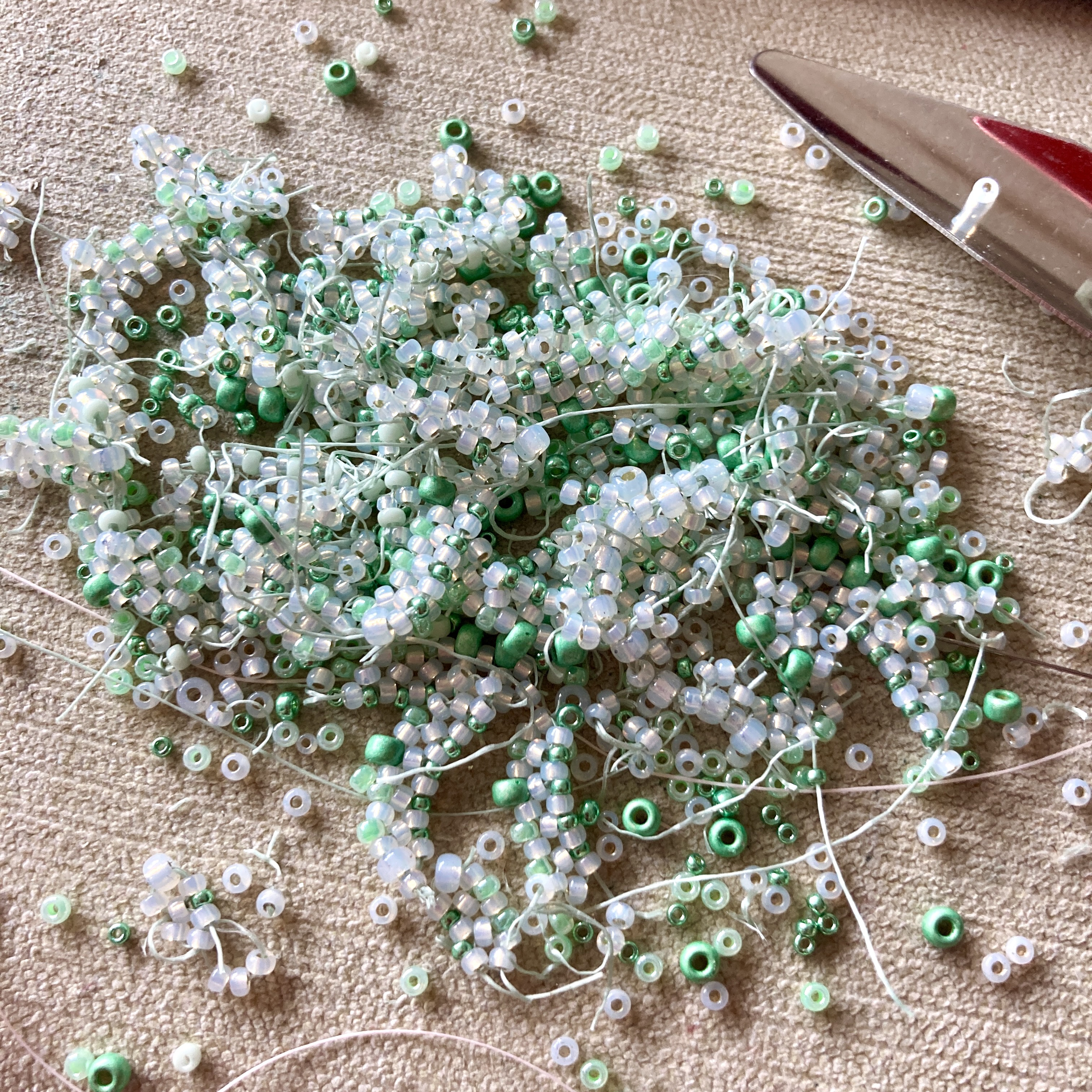 4) Other beads added with seeding – rizos, small czech drops, miyuki 2.8 & 3.4mm drops, and 11 seeds.