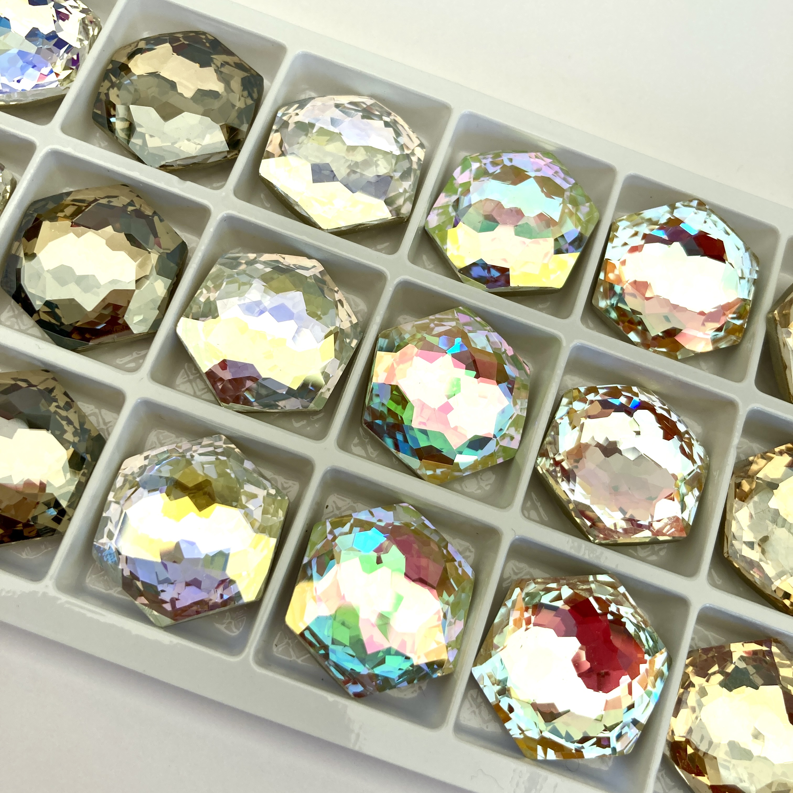 Happilly one day I was working on the materials section of the tutorial and needed to measure the crystals, leading to one of those ‘doh’ moments when you realise you’ve been daft. They’re sized across the parrallel edges as 18mm or 14mm, but point to point they’re actually 20mm or 16mm. I had 2 lonely 16mm Rivolis in my stash and hooray, they fit the bead count for the 14mm hexagon. The bezel ended up circular, so the backs needed some changes to fill the gaps that opened up in the delica peyote, but eventually I came up with some slight tweaks to allow beaders to adapt the 14mm version to make this with 16mm rivolis – they’re way way cheaper and much easier to get hold of, so I very much hope this will allow more of you to enjoy making this piece. If I’m honest I prefer the look of the hexagon versions to the rivolis, and the join beads don’t sit quite as neatly. However, the 14mm hexagons were £70 in total, and the 18mm hexagons I sell are £20 for a set (plus post and packing) so it feels important to offer a lower cost option – I paid £10 for the 16mm Aurora Rivolis from Old Bicycle Shop Beads and I think you’ll agree that’s fantastic value.